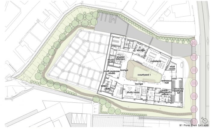 位于整个宿舍的共享空间鼓励各种规模和类型的互动。作为整个建筑的公共区域,一楼有自习室、各种工作室、厨房台面和食堂。生活基础设施,如厕所/淋浴间、洗脸盆和厨房,都被分配在二楼及以上的一个连续的八字空间内。这些生活基础设施是由12个宿舍房间共享的。学习室、榻榻米角和穿插在周边和庭院的公共空间(客厅)中的小型生活空间标志着一个连续的空间,就像一条有丰富的风和自然光的小路,无论学生的基础设施分组如何,这都会促进一个轻松的社区。
