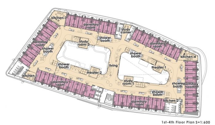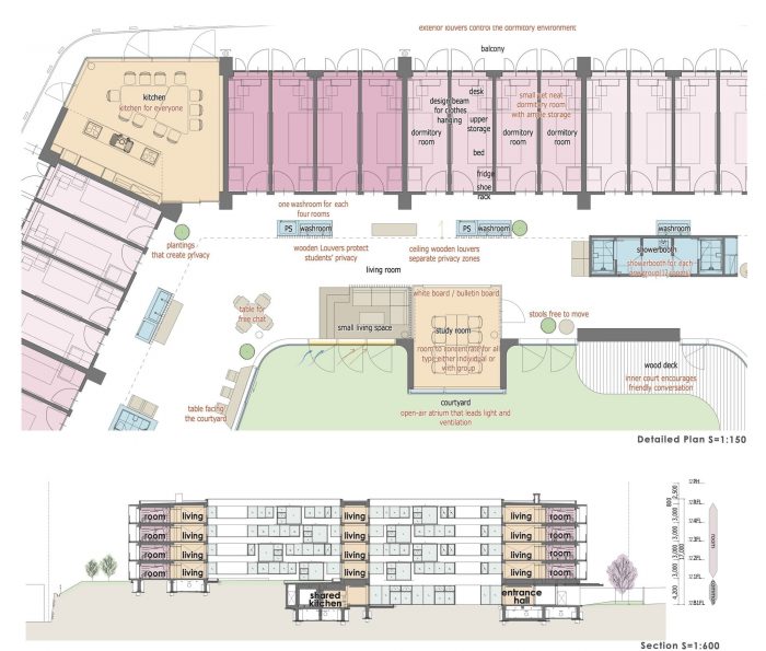 In the search for an efficient plan and rich living space-making under site conditions with strict shading restrictions, we proposed a fusion of the advantages of both the traditional dormitory style "private room type” for area efficiency, and the "unit-based type” for group formation. While each group that shares living infrastructure is formed by every 12 dormitory rooms, no distinction or partition was created between groups which enabled for a shared space to encourage interaction over group affiliation by providing free access to the kitchen, study rooms, etc.