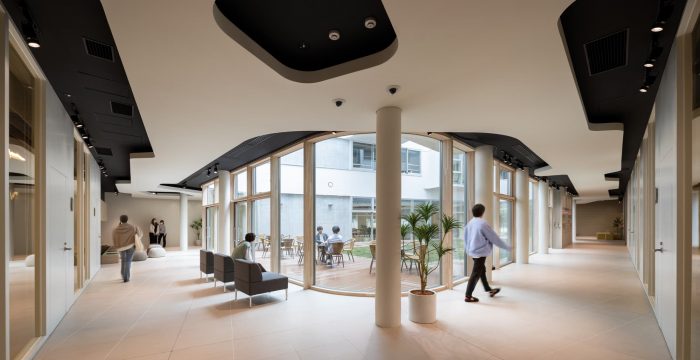 It was inevitable to consider the external impact (either physical or psychological) of the large student dormitory will have on the surrounding living environment such as shading, noise, and peer pressure. Whereas internally, it was required to create a fulfilling common space where dormitory students can actively interact with each other while improving the efficiency of the plan and maximizing the number of dormitory rooms. Therefore selected was a polygonal plan shape of irregular exterior wall that lines along the site shape. With its longest perimeter length, we have managed to control the feeling of oppression caused by height and wall length at the same time. By opening two lightwell functions in the polygonal plane, the interior was connected in the shape of figure 8, forming a rich common space where dormitory students can gather and socialize.