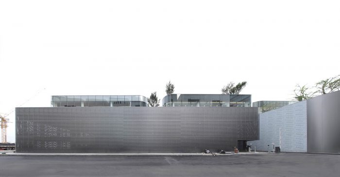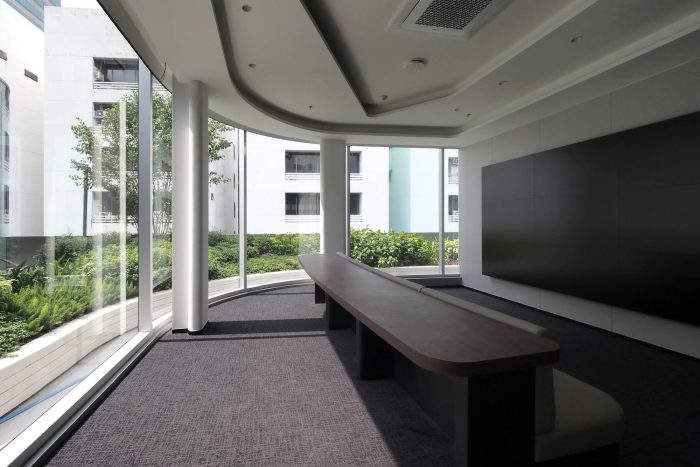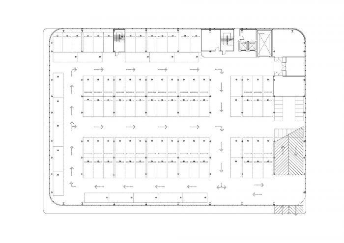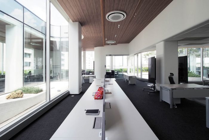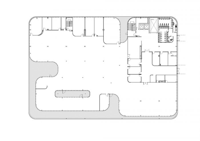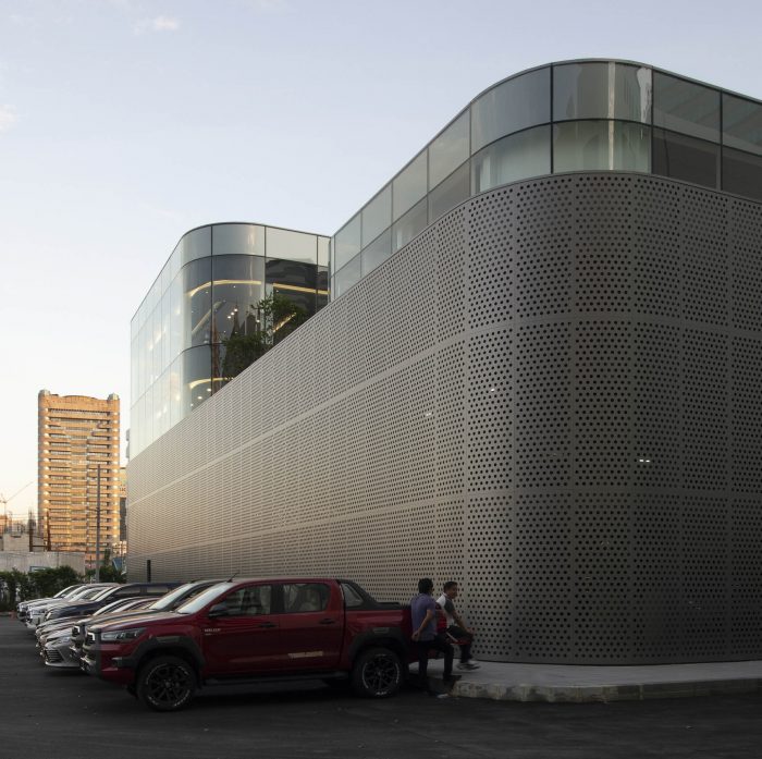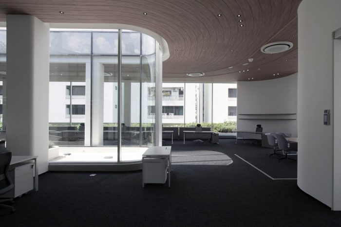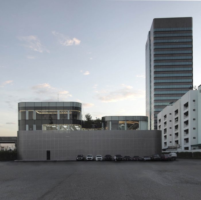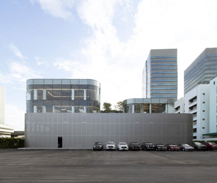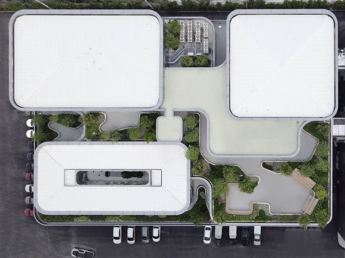 The office is the main building of the complex with almost 9,900 sq. m. with four floors. The first two floors use for indoor parking lots with a curved corner rectangular-shaped floor plan with the perforated aluminum facade, which allows light and air ventilation to the space. At the same time, the third and fourth floor has an overlapping racetrack-shaped plan with a continuous glass facade. On the third floor, the main office area has different ceiling height volumes and one central open court, which grants natural light to the whole space with the greenery view.