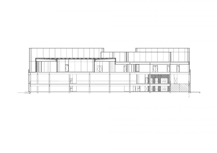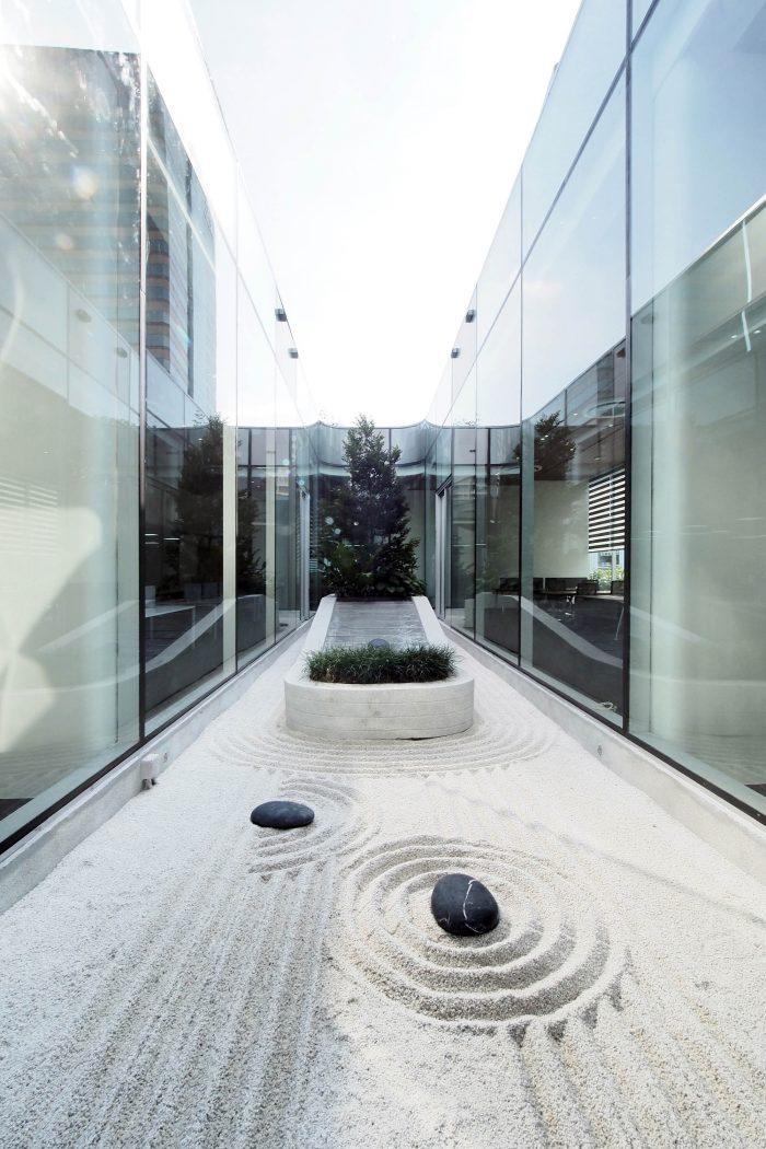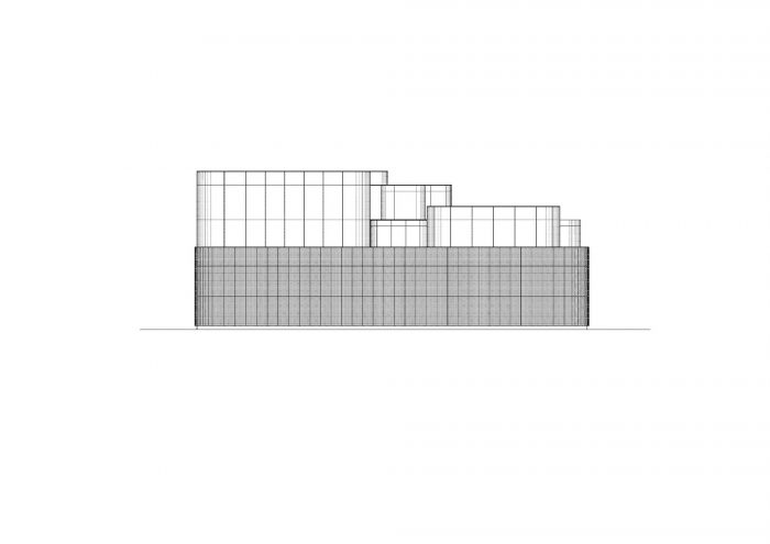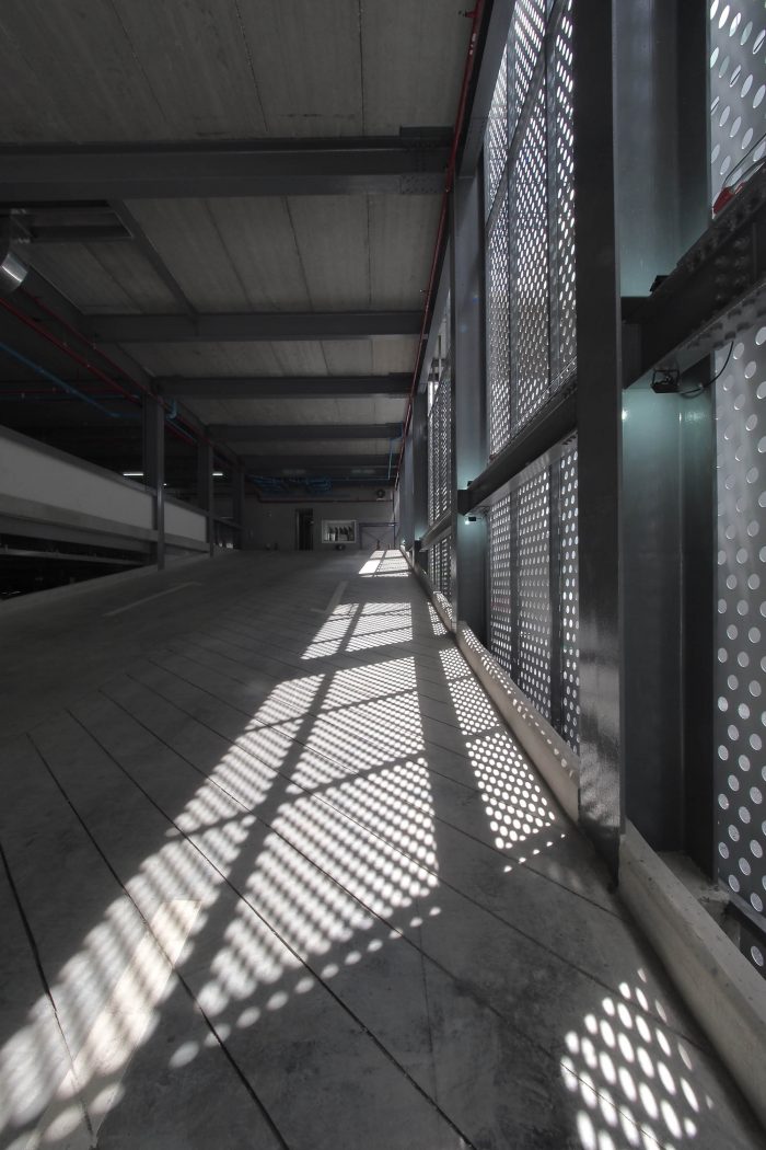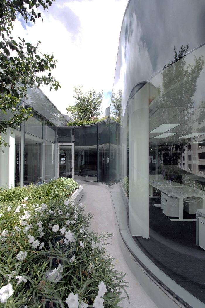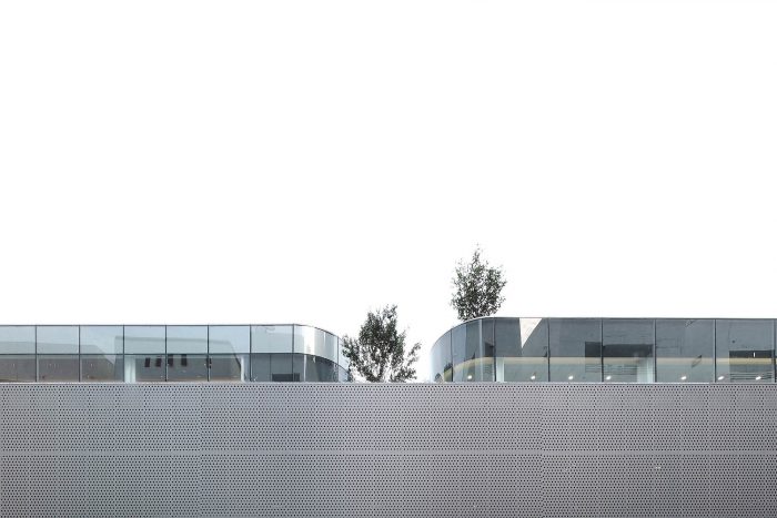 办公室是该建筑群的主楼,面积近9900平方米,共四层。第一、二层用于室内停车场,其弧形转角的长方形平面图与穿孔的铝制外墙,使空间的光线和空气得到通风。同时,第三和第四层有一个重叠的赛马场形状的平面,有一个连续的玻璃外墙。在三楼,主要的办公区有不同的天花板高度的体量和一个中央开放的庭院,这给整个空间提供了自然光和绿色景观。