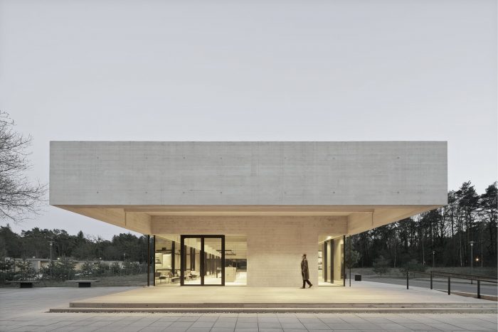 The visitor center is conceived as a linear moment in the form of a simple stationary structure. Slightly elevated above the forest level, the visitor enters the pavilion via a spacious reception terrace. Like a "welcoming gesture", the massive cantilevered canopy above the terrace invites its audience to enter. The building, which is glazed almost on all sides, offers sufficient space to experience the special atmosphere and to linger. At the same time, the building assumes its functions of welcoming and providing with an open flowing sequence of rooms.