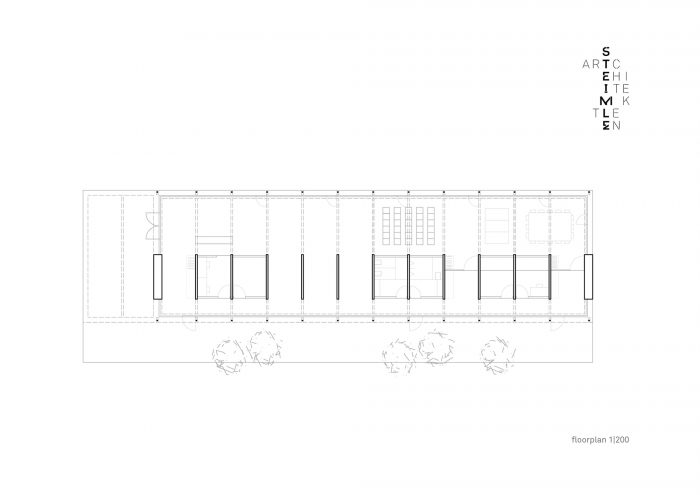 Towards the “Bundesschule” in the east, the large showroom, which occupies the entire length of the building, can be divided completely flexibly and, with its open façade, is in constant visual contact with the listed building. The ancillary rooms are compactly oriented as a sequence of rooms to the west toward the parking areas. The chosen design language of the building is inspired and reflected by the graphic systems and technical equipment of the Trade Union School and achieves an independent aesthetic by following its function.