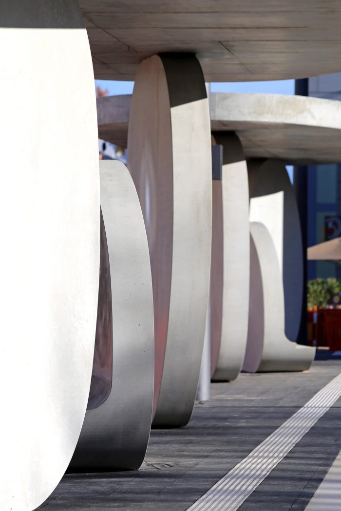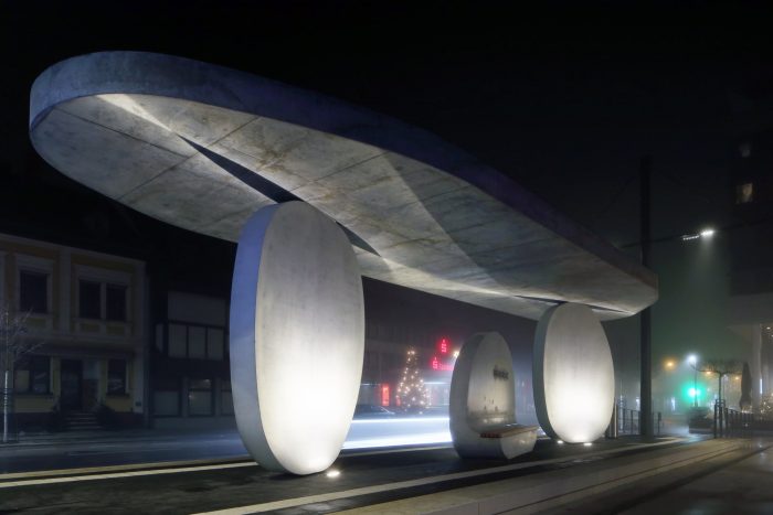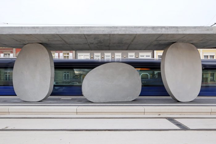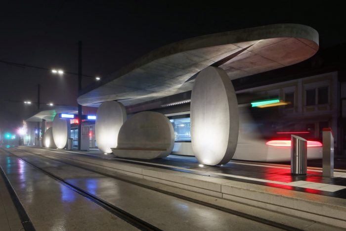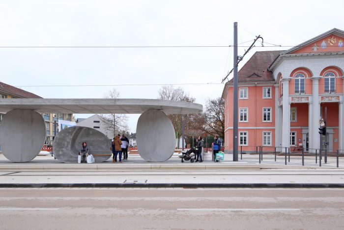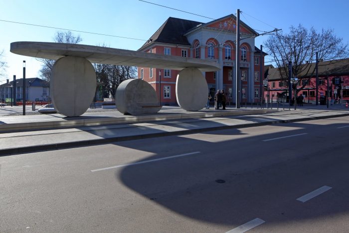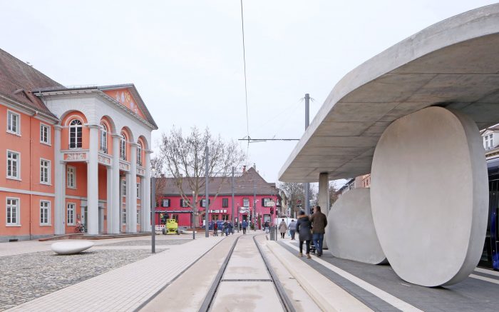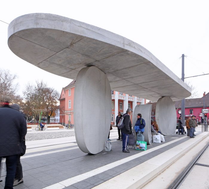 At the other end of the line, at Kehl City Hall on the German side, a stop has now been erected, a composition of bright round, exposed concrete discs that condenses aspects of dynamism, balance, lability, and mobility in an infrastructural sculpture. Both terminals are characterized by unique architecture, and everyday “minor border traffic” commutes between the two.