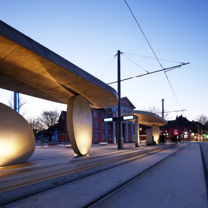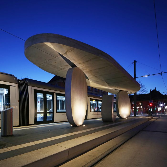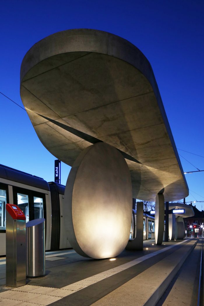 The new public transport connection between Strasbourg in France and Kehl in Germany underscores the cohesion of these countries at the center of the European Union. On the French side, a landscape-like spatial fold designed by Zaha Hadid was created for the terminal station in 2001.