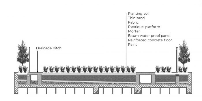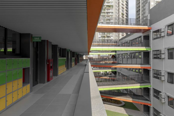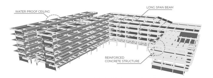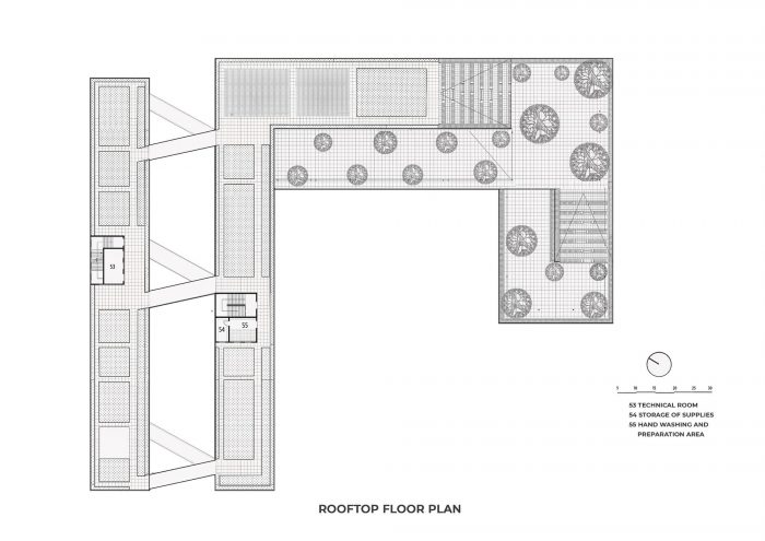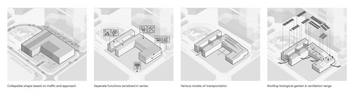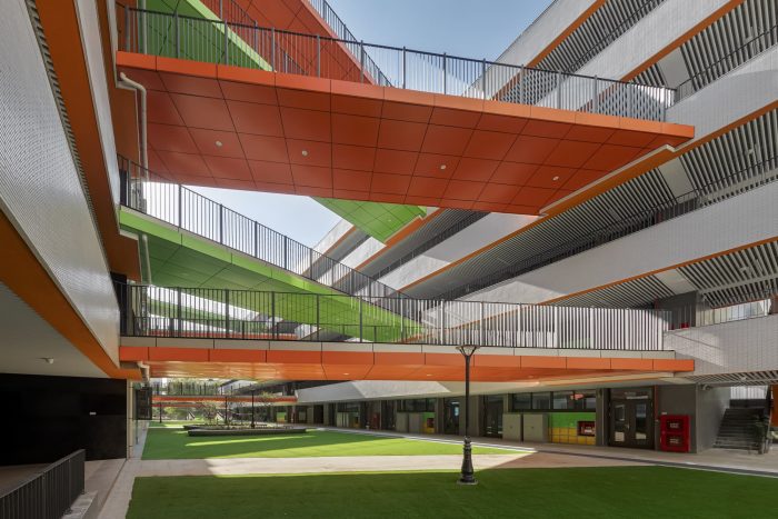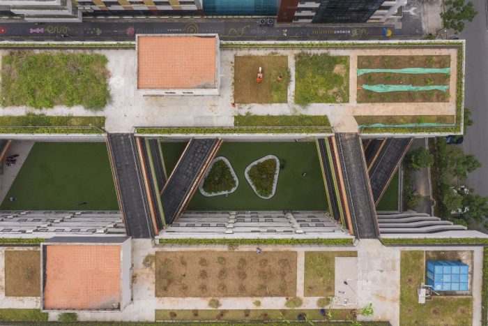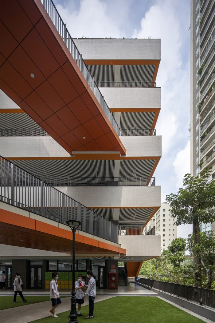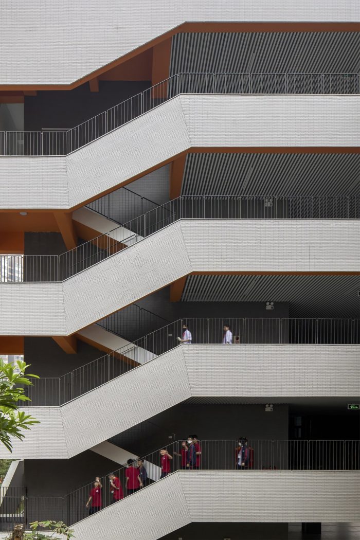特别是,屋顶的设计目的是为学生创造一个绿色空间和植物园。虽然内城学校的自然体验空间越来越被遗忘,但保持屋顶上的绿色空间可以培养学生对自然界的理解和体验。由于该项目采用了4.0技术的自动农业的应用,学生可以见证并参与到农业生产过程中。由于建筑密度低,学校的建筑旨在将绿色空间带到高楼层:6000平方米的蔬菜和绿色花园被规划成多种类型--适合每个季节的高低树木,如蔬菜区、花卉区、户外图书馆区等。从公寓的角度看,整个学校就像在拥挤的城市中心的一个绿色公园。建筑的设计采用了极简主义风格,利用建筑本身来发挥建筑美学价值,与该地区的整体景观融为一体。色彩简单而灵活,富有吸引力。
