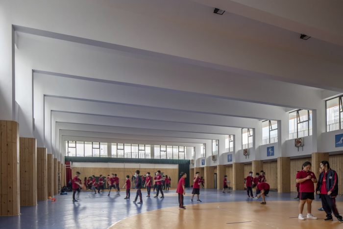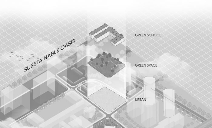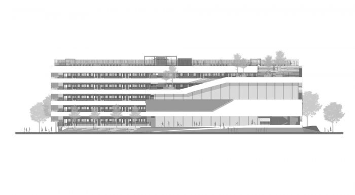 目标是在东北-西南轴线上优先安排教室,以实现最佳的通风和自然采光,并确保舒适和防噪音。学校被规划在土地的背面,远离主干道。具有多种功能的体育馆可以为社区服务,如游泳池,多功能区安排在主干道旁--方便进出,起到了防止主干道的噪音影响教室的作用。