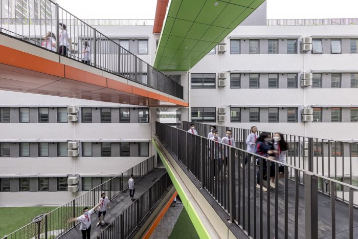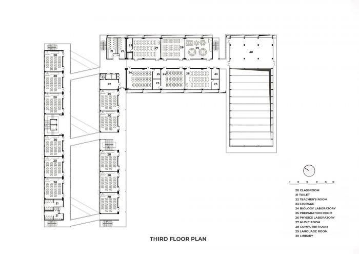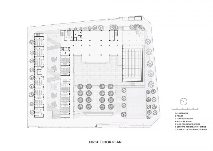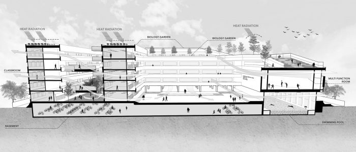Tran Duy Hung Street (Cau Giay district, Hanoi) is considered one of the new urban areas with rapid development, densely populated with many housing projects, high-rise apartment buildings, service works with modern architecture. The design task was to build a new public secondary school with a scale of one basement, 5 floors, 44 classrooms full of subject classrooms, a multi-purpose zone, swimming pool which all fully meet the national criteria level 2. The idea of planning the master plan is based on a block combination, the main façade is facing the southwest road. The building includes classrooms, functional classrooms, and a gymnasium that is altogether connected through a bridge system, covering the central courtyard.