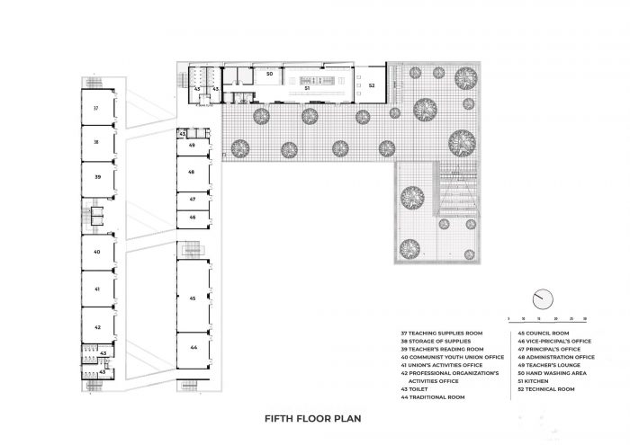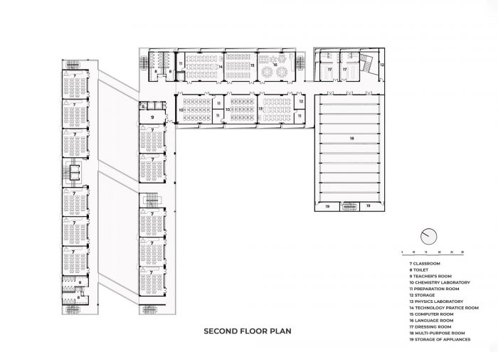 Tran Duy Hung街(河内Cau Giay区)被认为是快速发展的新城区之一,人口密集,有许多住房项目、高层公寓楼、现代建筑的服务工程。设计任务是建造一所新的公立中学,规模为一个地下室,5层楼,44个教室,充满了学科教室,一个多功能区,游泳池,这些都完全满足国家二级标准。总体规划的思路是以街区组合为基础,主立面面向西南方向的道路。建筑物包括教室、功能教室和体育馆,它们通过一个桥梁系统连接在一起,覆盖在中央庭院。