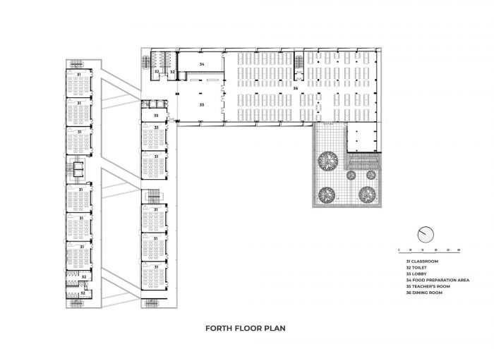 The goal is to prioritize the arrangement of classrooms at the Northeast - Southwest axis to achieve optimal ventilation and natural lighting and to ensure comfort and noise protection. The school is planned at the back of the land, far from the main road. The gymnasium with many functions can serve the community such as a swimming pool, and multi-purpose area arranged adjacent to the main road - convenient in access and plays the role of preventing noise of the main road from affecting the classrooms.