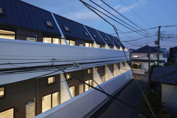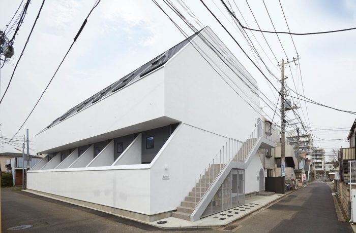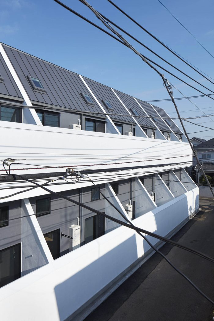 Located close to Sagamihara station, approx. 40 min. from central Tokyo, “TRAYS”, a two-story apartment of 12 residential units stands in suburb residential area mixed with large apartment complexes and detached houses. Being designed within the framework of two-story wooden apartment building in architectural regulations, “TRAYS” materializes a quality comfort of privacy and space in living by introducing the concept of “TRAY”, a residential unit complete with dwelling unit, balcony, and porch as a detached house. “TRAY”s are stacked on top and aligned to form an apartment building.
