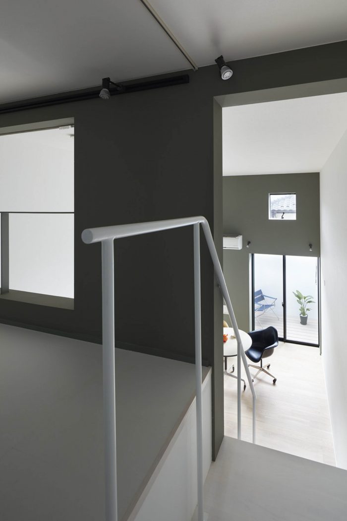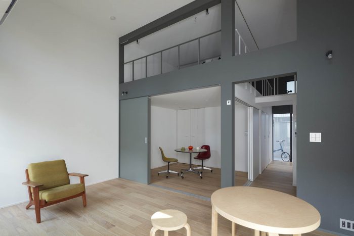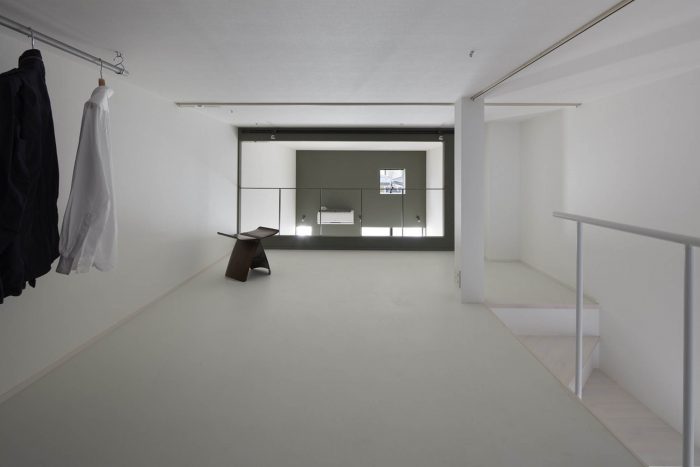 Interior of “TRAY” is finished in white, partitioned by grey wall to segment porch, dwelling unit, and balcony. All residential units have lofts and high ceiling, making the maximum height of the two-story apartment almost 10 m. In proportion to the height of the apartment, outer walls of “TRAY”s are also high to secure the privacy from outside while diagonally cut walls in the balcony and porch allow intake of light and wind, defining unique form of the building.