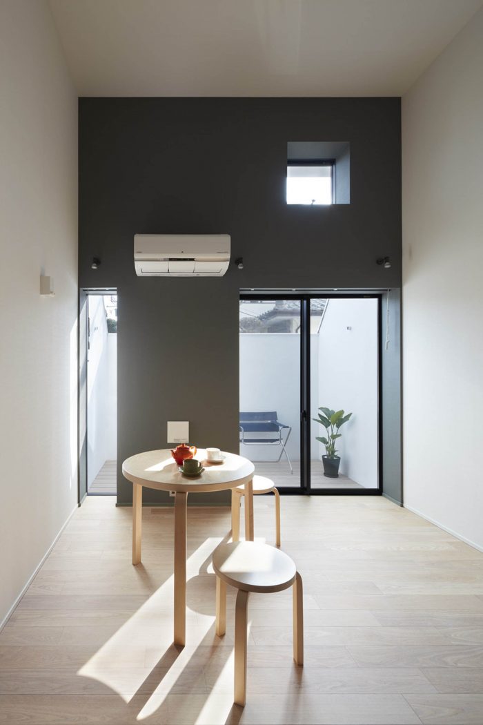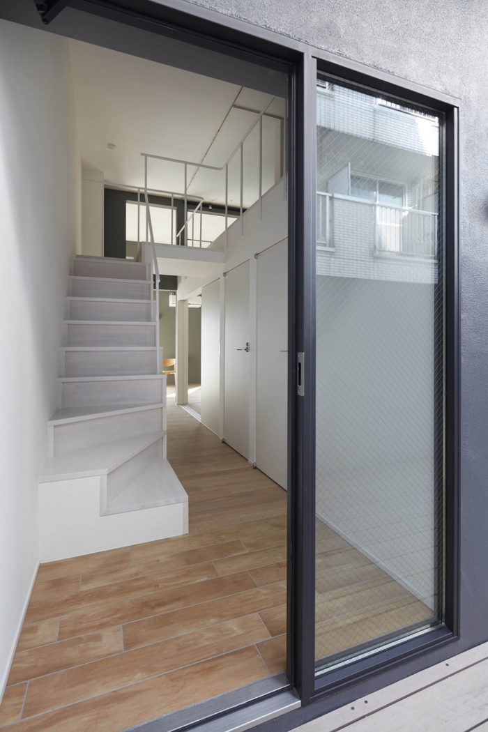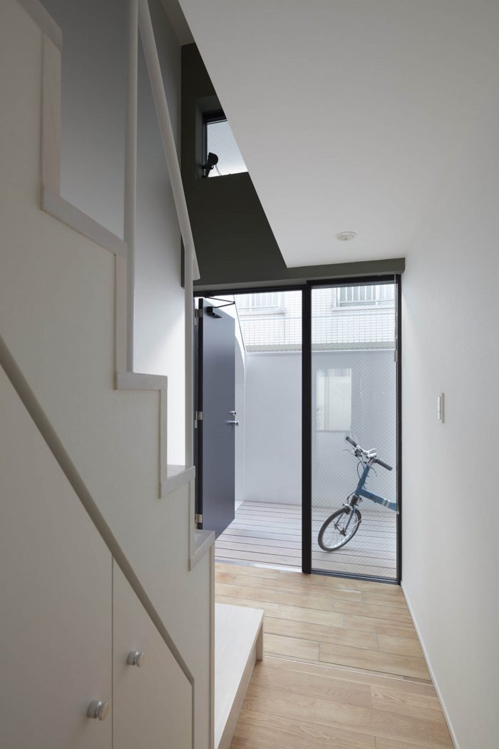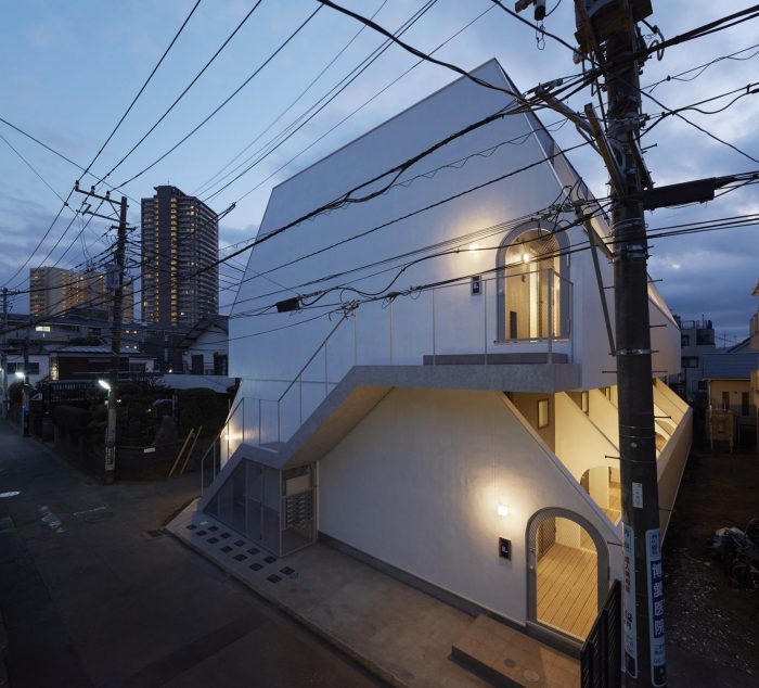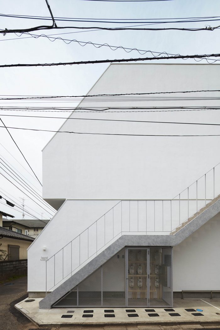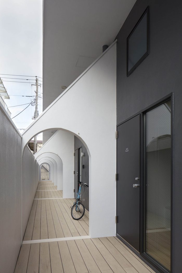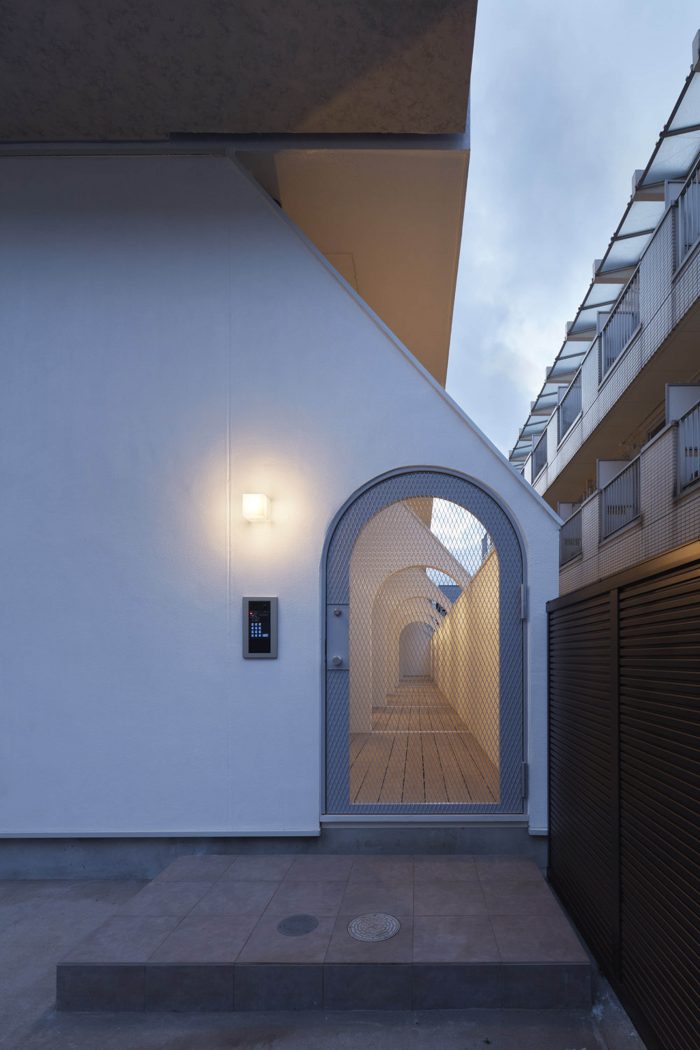 “TRAYS” is built on maximum building coverage ratio as well as setback-line limit, utilizing the maximum volume allowed within the building condition of the premises. Porch, sandwiched between walls with arch shape opening, is a space in front of the door where tenants can put their bikes which also serves as corridor in continuation with “TRAY"s.
