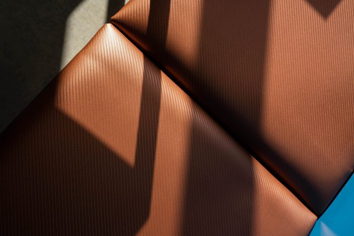 The preexisting neutral shades are contrasted by a dynamic palette of colours, studied together with the Color Consultant Sabina Guidotti. The wall cladding in deep blue majolica with contrasting brick-colored joints, fuses with the orange plum and bluette veins of the counter, while the recycled iron chairs in yellow and flesh-pink complement the leather colour of the benches covered with a nautical technical fabric and with the tables, also in recycled iron, equipped with coloured wood tops, rolled ad-hoc with soft decorations.