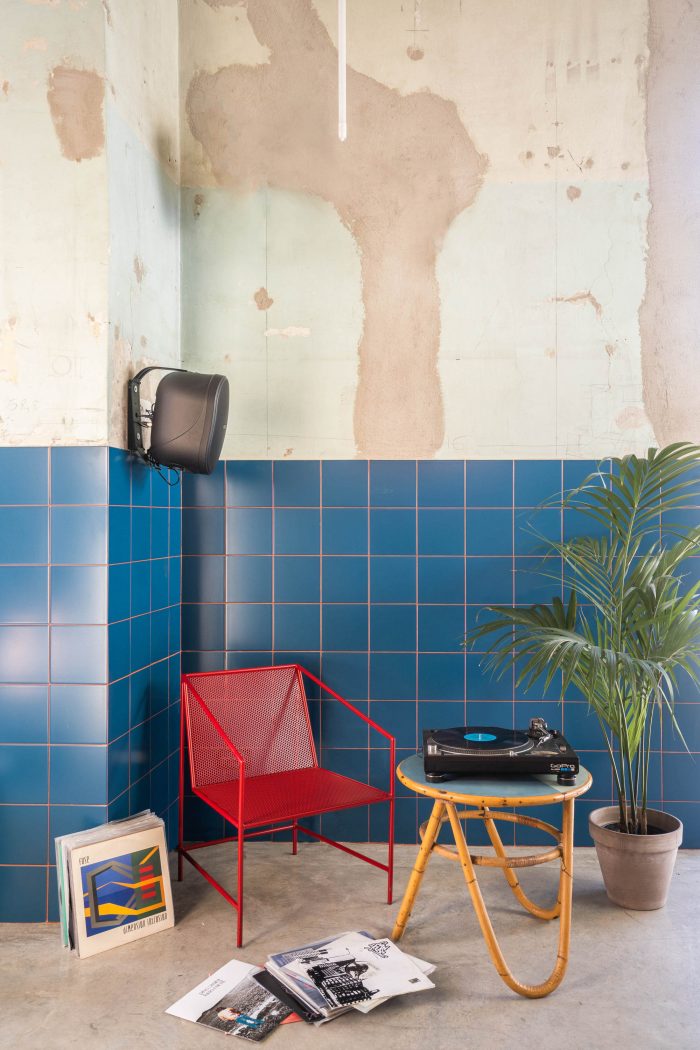 与色彩顾问Sabina Guidotti共同研究的动态调色板与原有的中性色调形成对比。墙面采用深蓝色的马霍洛尼卡材料,对比鲜明的砖色接缝,与柜台上的橙色梅花和蓝色脉络相融合,而黄色和肉粉色的回收铁椅与覆盖着航海技术织物的长椅的皮革色相得益彰,桌子也是回收铁制的,配有彩色的木质桌面,上面还卷有软装饰。