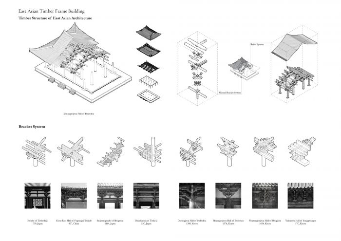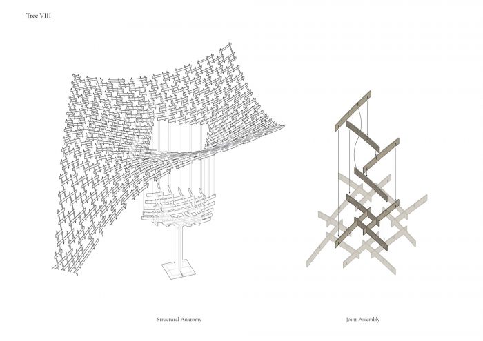 The "Tree Series" is a series of design projects that recreate the wooden bracket system of East Asian architecture. The system is the most iconic part of East Asian wooden buildings in both structural and aesthetic aspects. Structurally the system works in a critical capacity by connecting the roof structure, columns, and beams all together into a single system and by distributing the loads and assuring continuous load paths. Aesthetically the system gives three-dimensional effects through the complex assembly of wooden elements with joinery. The purpose of the "Tree Series" is to analyze the traditional bracket system and recreate it for the structure and fabrication process to be compatible with the contemporary industry of architecture. However, the "Tree Series" rejects a process called "modernization" of traditional architecture, which merely aims at the efficiency of construction and imitation of a traditional style. Rather, the "Tree Series" aims for a totally new, experimental, and radical rebirth of the traditional system.