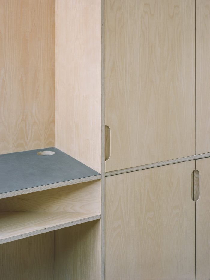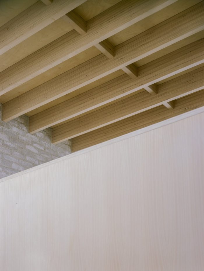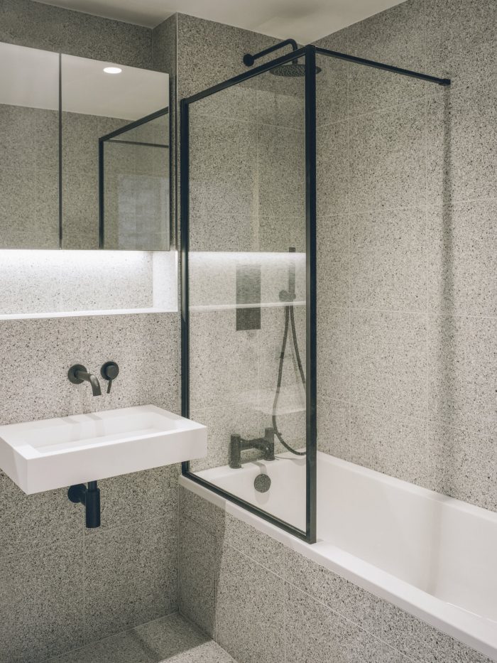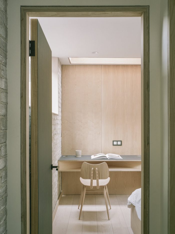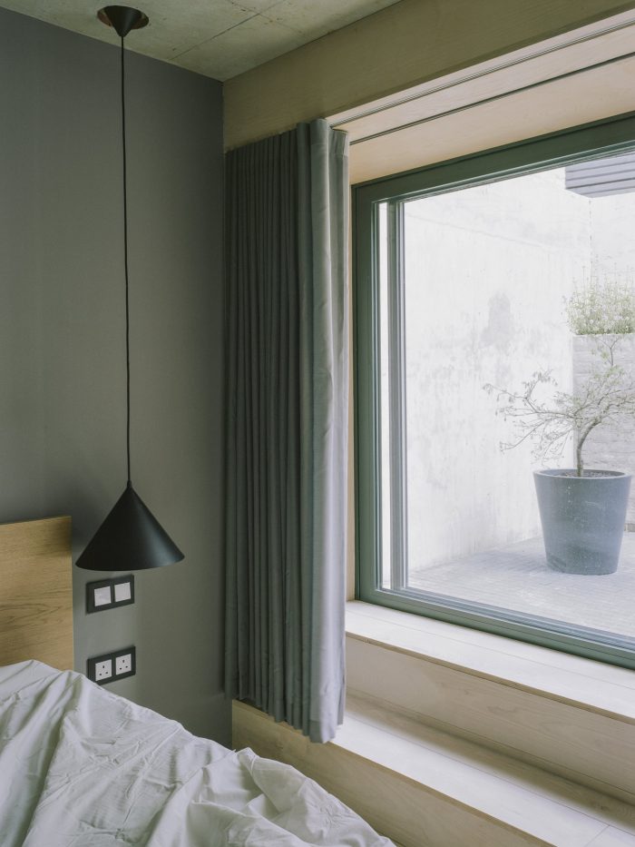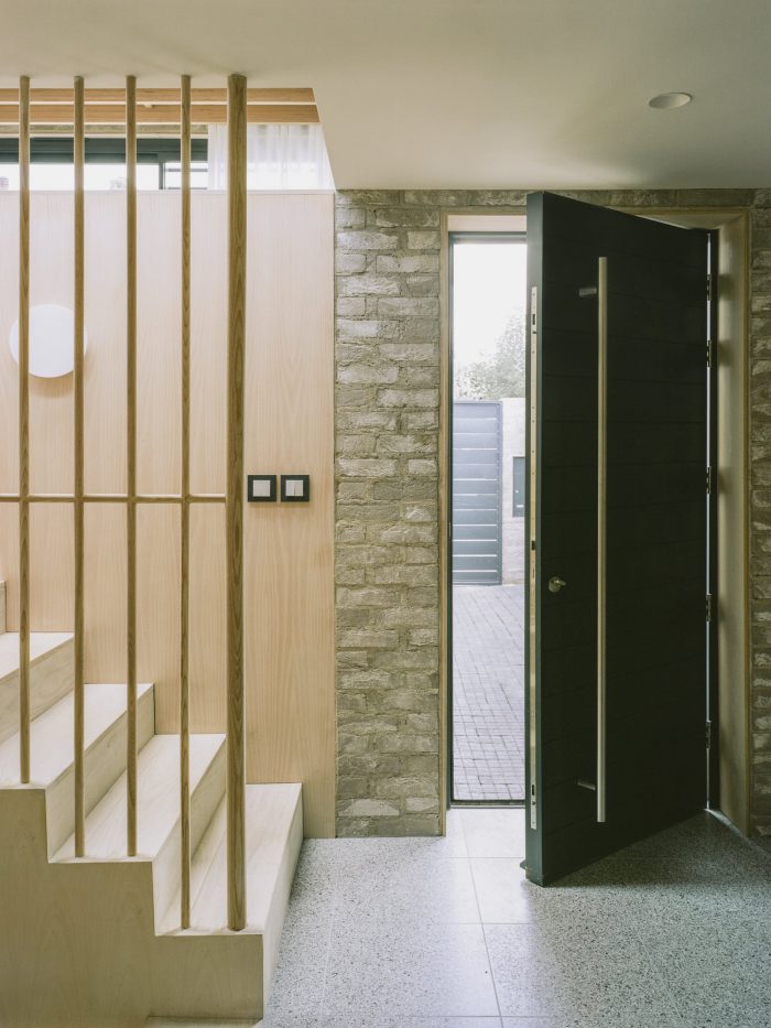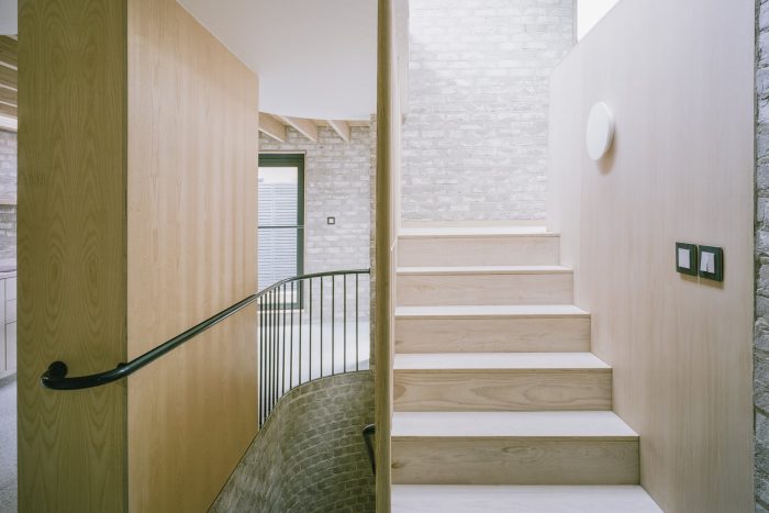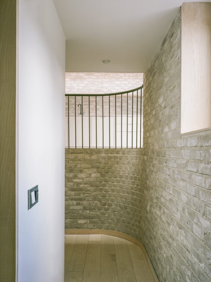 Using primarily three exterior materials: grey brick, black timber, and tubular metalwork, the palette is simple where the rough facing brick and flush lime mortar joints contrast the sharper and darker detailing. The simplicity and rawness of finishing are carried through to the internal spaces were brick walls, ash joinery, terrazzo tiles, and delicate metal balustrades contribute to a comprehensive vision.