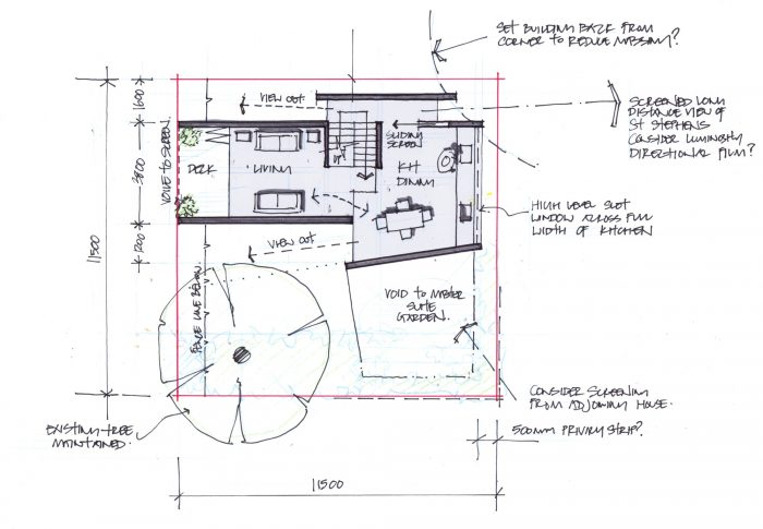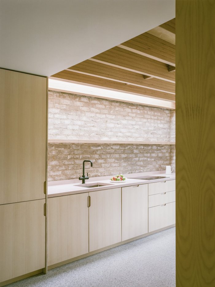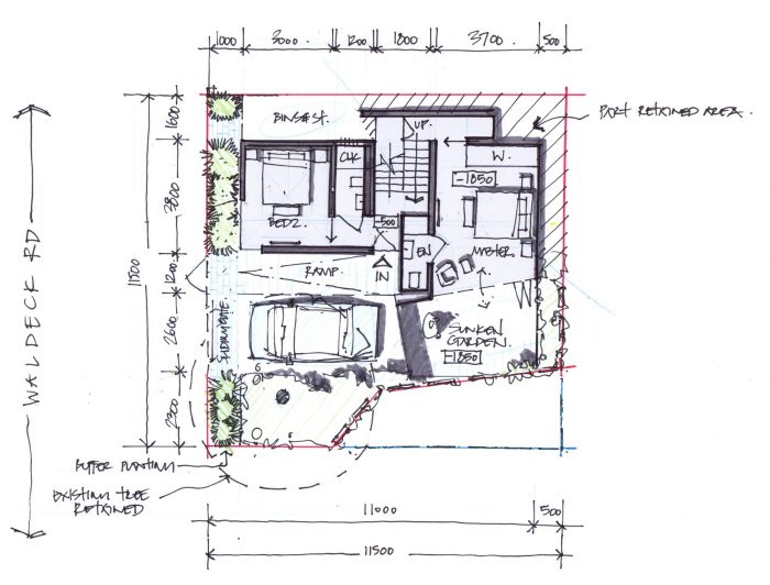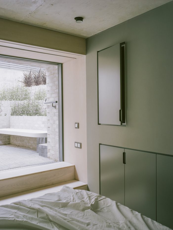 Two bedrooms and associated bathrooms are submerged within the semi-sunken floors. A sunken planted courtyard is accessed via stepped brick planters and a paddle stair constructed of black cobble setts.