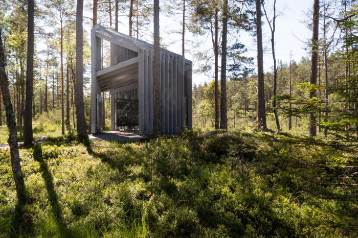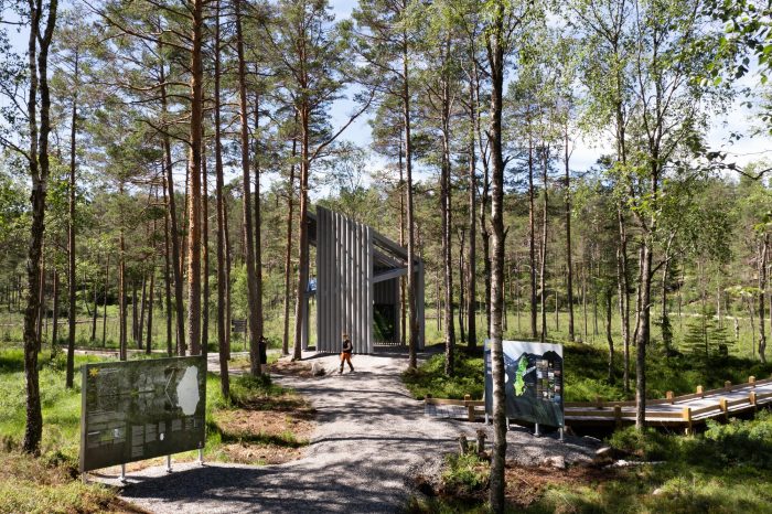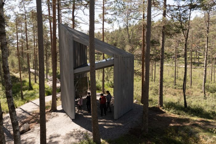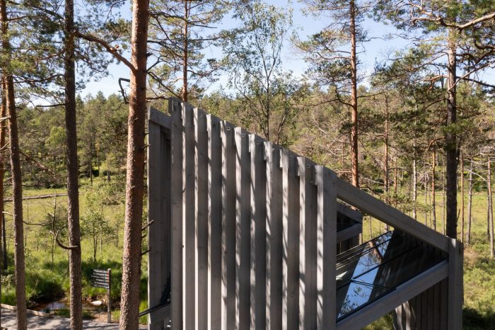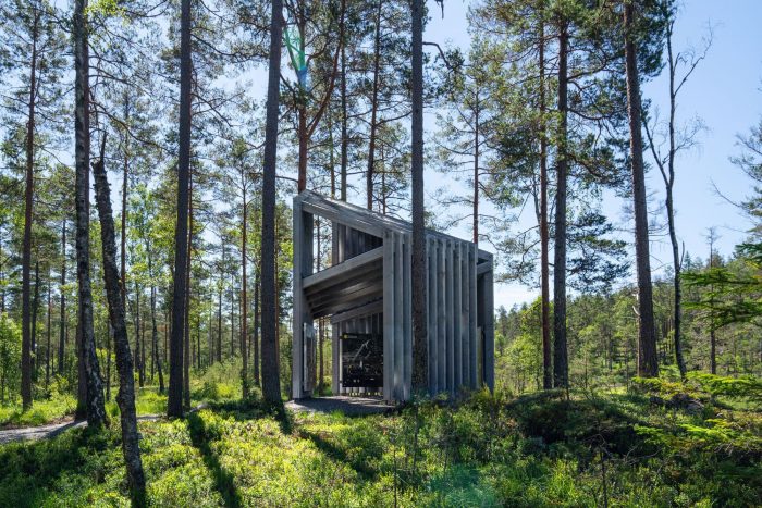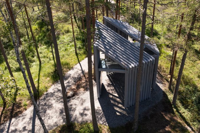 The new pavilion in the national park of Tresticklan is situated in Dalsland, close to the Norwegian border. The park is the largest uninhabited area in the south of Sweden with over 30 square kilometers of roadless land, dominated by harsh, dry marshlands and lakes. "Trestickel" means trident, possibly a reference to the shape of Lake Stora Tresticklan in the vicinity of the park.