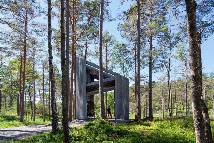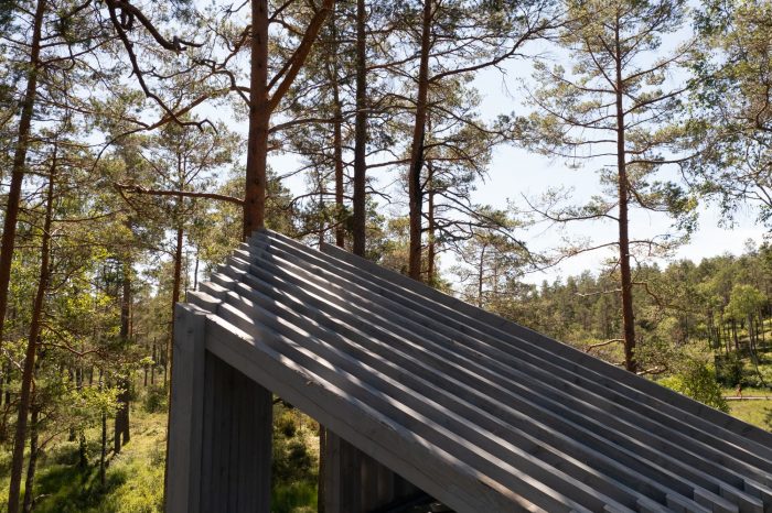 Its dimensions and transparent wooden walls seek a well-balanced form in relation to the surrounding pines, blending with the linear shadows of the pine trunks, and gradually adapting to the context in a quiet manner. The pavilion is completely made of Swedish timber and the treatment with pigmented linseed oil creates a low-key interplay between the site-specific grey wooden building and the graceful pine trunks.