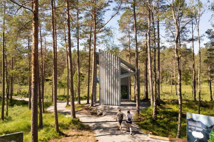 这座简单而有条理的建筑的灵感来自于当地的地方建筑,其中的屋顶结构(桁架)融合并向天空扭曲。当游客在建筑周围移动时,这个有棱有角的结构既是一个废墟的形状,也是一个新的建筑,在我们的时代和该地的古老历史之间进行交流。从上面看,展馆的六边形被揭示出来,其灵感来自于瑞典国家公园品牌的象征。