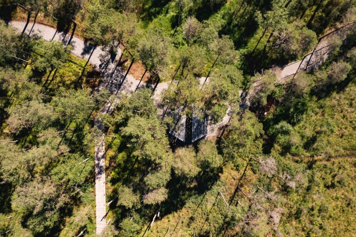 The simple, yet articulate building is inspired by a vernacular, regional architecture where a roof structure (truss) merges and distorts towards the sky. As the visitor moves around and towards the building, the angular structure takes the shape of both a ruin and a new build, communicating between our time and the ancient history of the site. Seen from above, the pavilion’s hexagonal shape, inspired by the symbol accompanied by Sweden´s Nationalparks brand, is revealed.