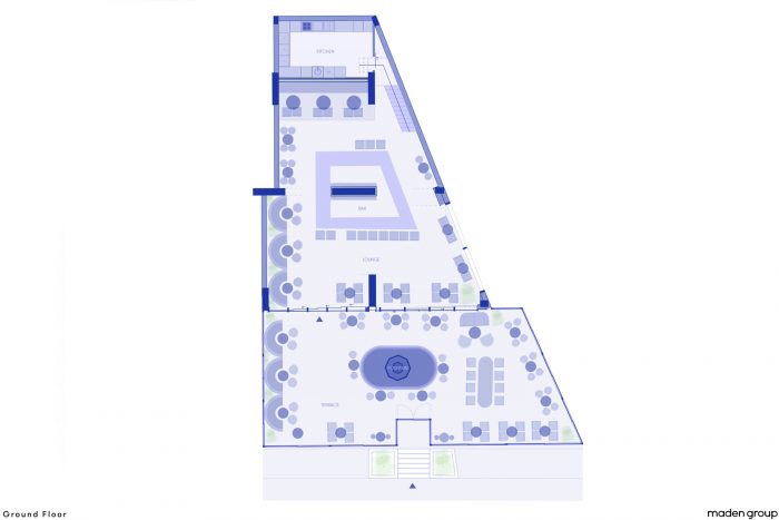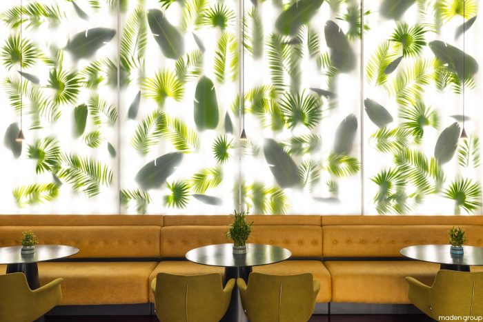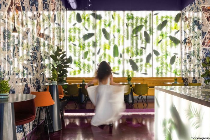 喷泉的顶部是植物,在上面安装的霓虹灯条的照耀下,完成了整个外观。白天,自然光线充满整个空间,为植物创造了一个自然的焦点,而到了晚上,则让空间变得明亮。紫色和绿色的配色方案将你引向一个开放的酒吧。