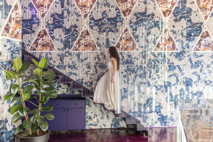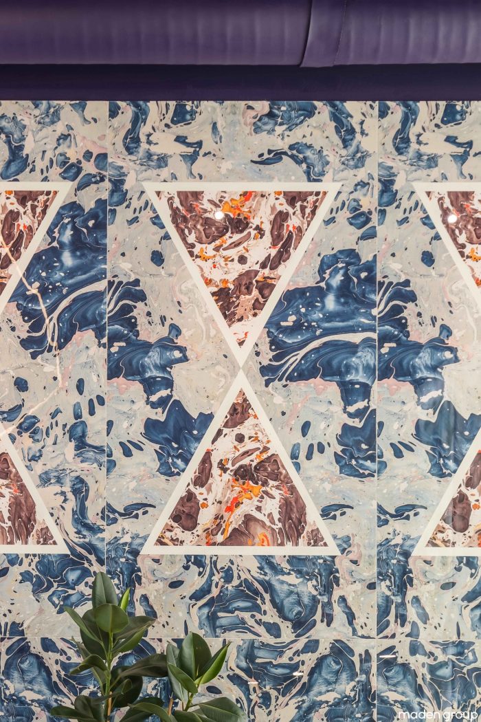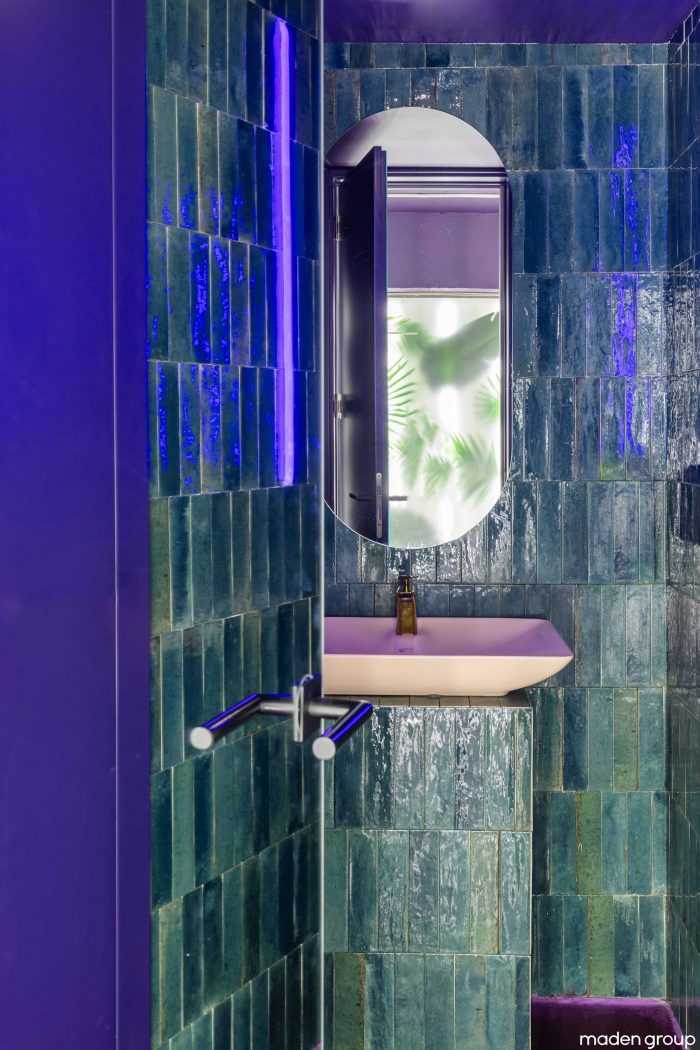 At the top of the fountain are plants that complete the look illuminated by the neon strip lights that are installed above. During the day, natural light rays fill the space and create a natural focus of the plants, while at night, it leaves the space bright. The purple and green color scheme directs you towards an open bar.