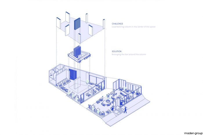 As part of our culture, once we find a new place of residence, we can easily spend different hours of the day for different occasions in the same place, especially when the work is added to the work of different artists, who give local value. The challenge of this project, in addition to the many pillars in the bar, which I eliminate through interior design, was also to create a space that fits harmoniously with several components. Works of art, colors, and plants, are these three components that complement each other and harmoniously become one.