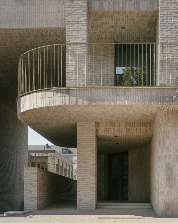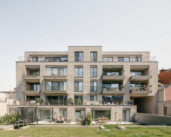 Three outdated terraced houses were demolished and replaced by a residential complex with 21 flats and an underground car park. In the design, particular attention was paid to the architecture of the street frontage, aiming for 'the size of the street'. Many large-scale projects have already been built in Maastrichtersteenweg, whereby several plots have been joined together. In response, we searched for a vertical articulation that of more narrow dimensions, similar to those of a classic townhouse. For this reason, the façade is composed of six bays, each with a different width. Staggered sections between the bays, both to the front and the back create a façade with a clear fragmentation. In this way, the project seeks to connect to the grain of the existing streetscape.