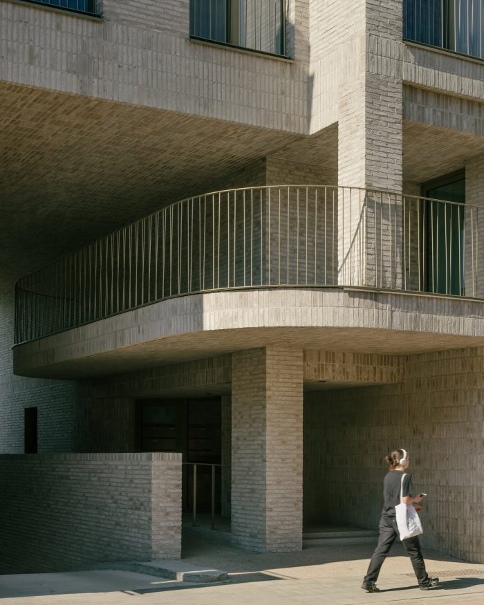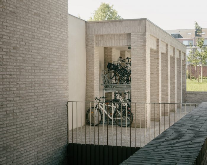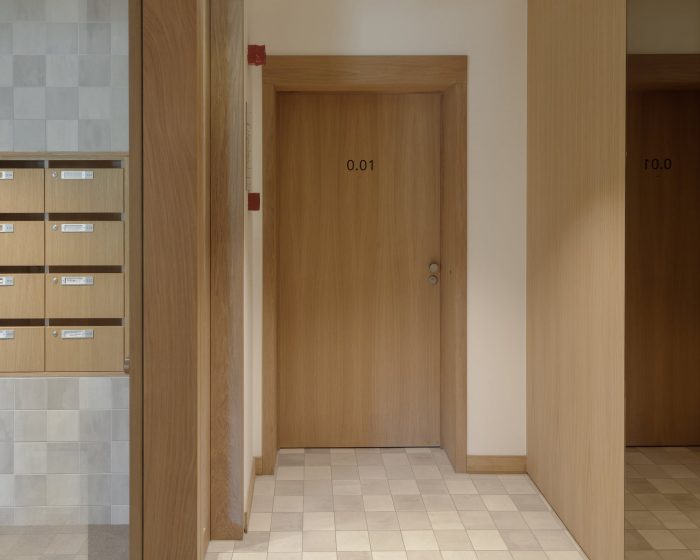 A spacious, double-height main gateway on the east side of the plot provides access to the entrance hall and the underground car park, but also and above all to the shared semi-public inner area and the bicycle shed. This airy access is articulated by the protruding terrace of one of the flats on the first floor, which welcomes residents and visitors and guides them to the covered entrance area and the gardens that lie behind it.
