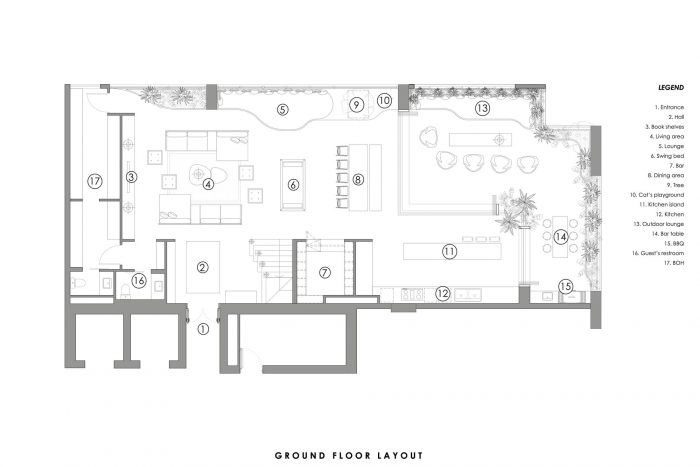 主要的空间发生器是长凳,它从房子的一角延伸到另一角,创造了房子的不同社交空间,并作为茂盛的绿色植物的一个花盆箱。室外阳台的顶部是一个绿色的天花板形式,浮动的花盆盒悬挂在板块上。这个巨大的阳台是房子的主要特征,因为它的海滩俱乐部般的氛围在西贡是独一无二的。