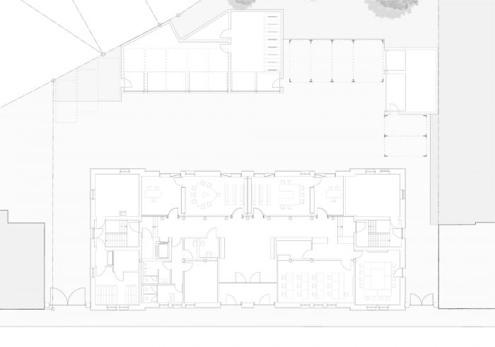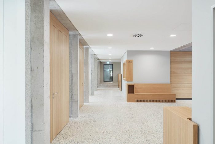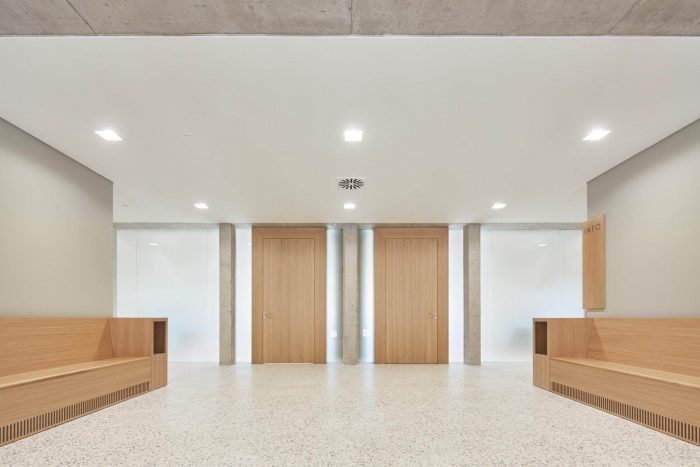 The former garage doors to the rear were opened up to allow light into the courtrooms. Reminiscent of the wooden gates, the glass panes are staggered in terms of their depth, lending the façade a moving pictorial quality. The foyer, with its skilfully placed sparse accents, reflects the dignity of the court. The inserted reinforced concrete ceiling, which is attached to the expression of the removed ceiling, is visible in places as a construction. Roughly plastered walls and the sanded, exposed screed contrast harmoniously with the oak wood of the furnishings, while asymmetrical reinforced concrete columns pick up dynamically on the brittle nature of the earlier functional building.