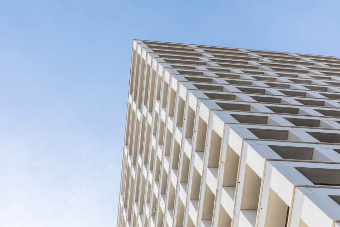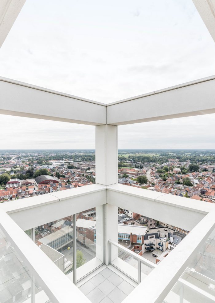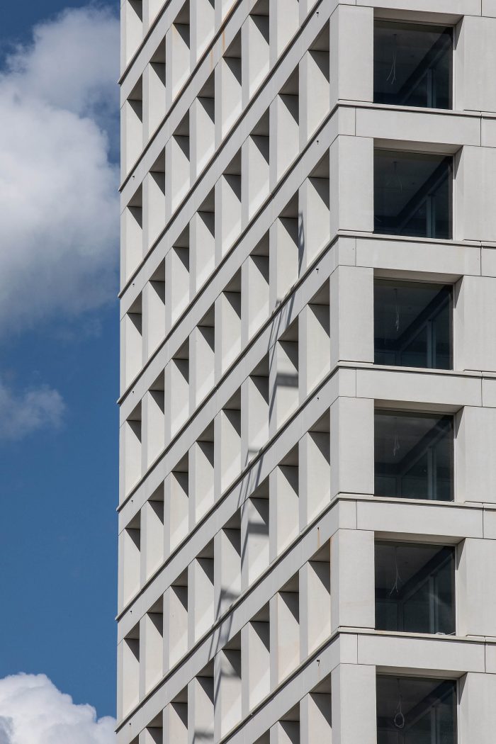 The functions that are present in the tower – residential, office and restaurant – are visible in the façade: a dense raster of columns and beams was used for the apartments; the bay size being determined by the size of the bedrooms. This grid widens at the height of the offices. A very open raster was used for the upper restaurant floors, to accommodate an open plan and to maximise the view.