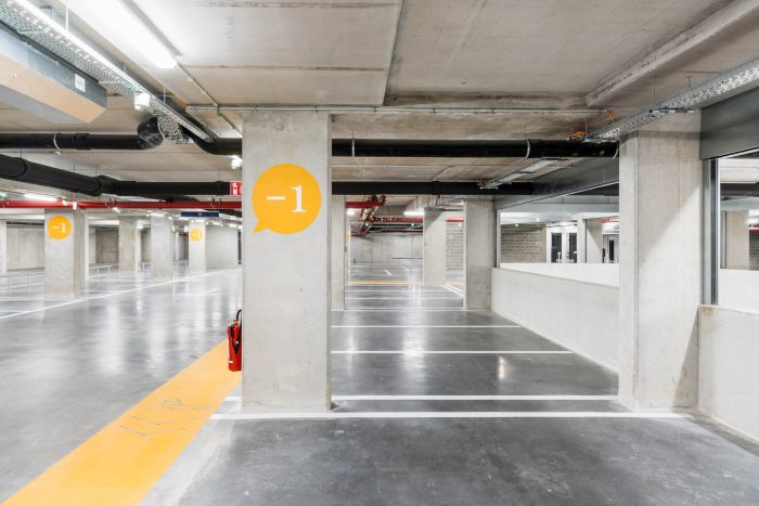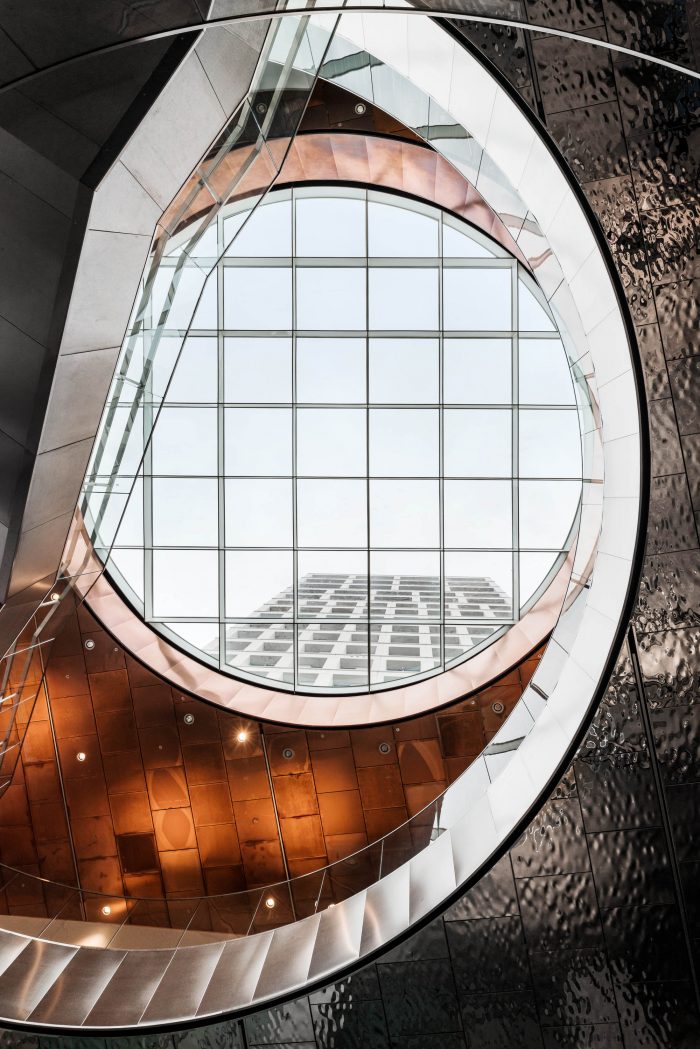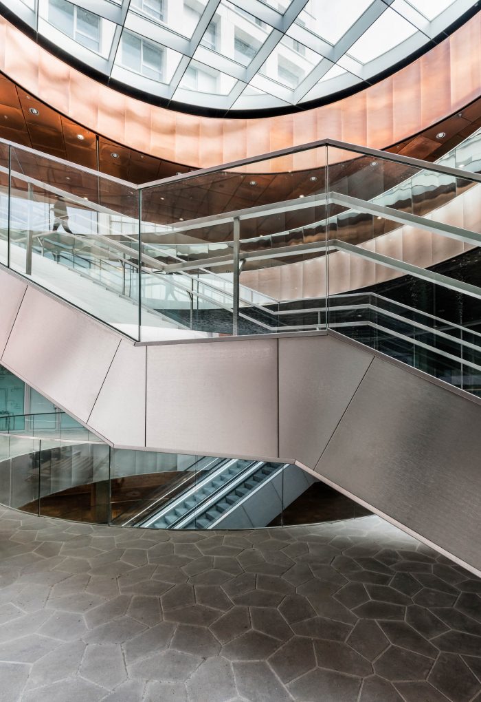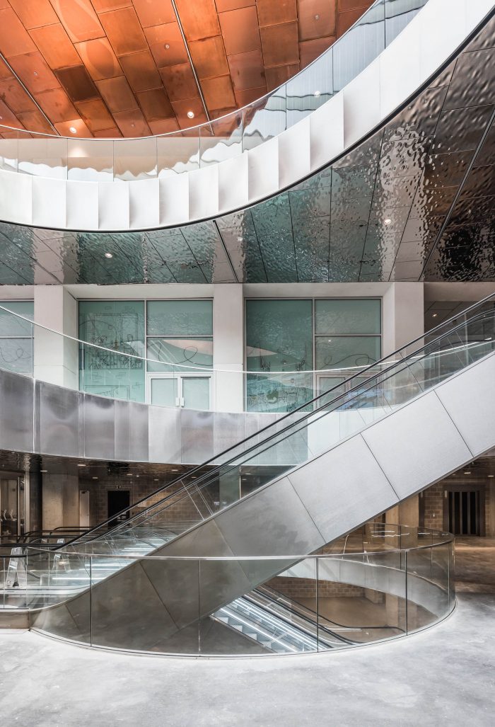 In the centre of the base of the tower is a monumental point of ascent that connects the two underground levels of the paid car park to the new square and to the shopping centre. There are various escalators and an immense staircase under a large circular dome.