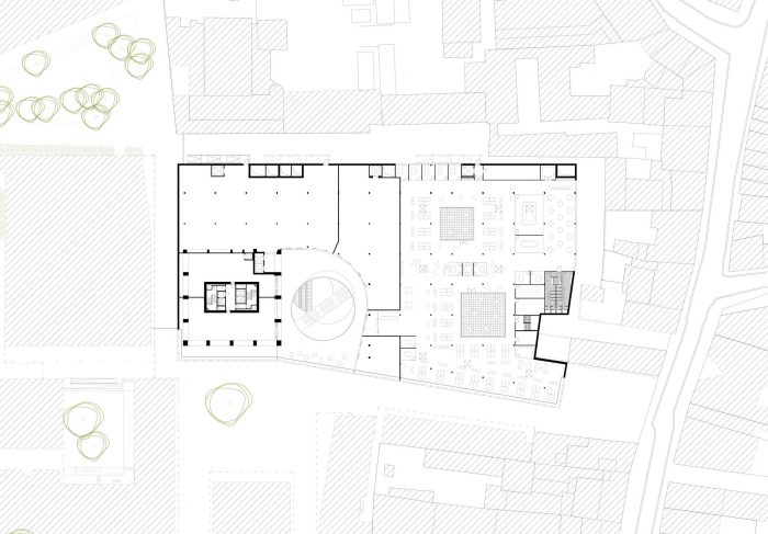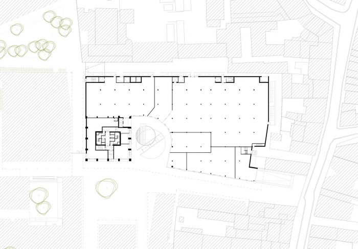 在塔基的中心是一个标志的上升点,它将地下两层的收费停车场与新广场和购物中心连接起来。在一个巨大的圆形穹顶下有各种自动扶梯和一个巨大的楼梯。