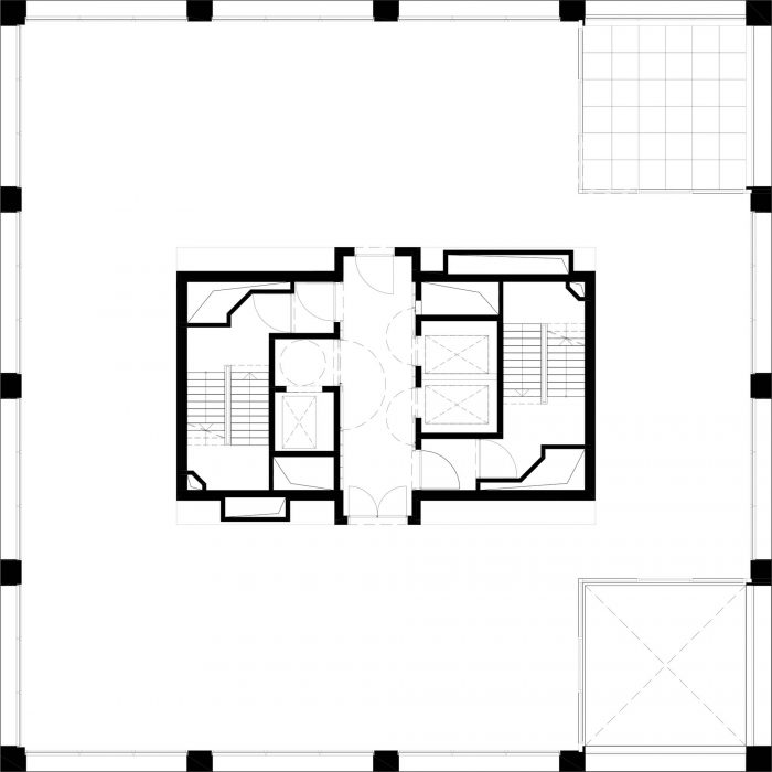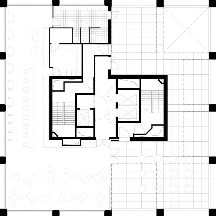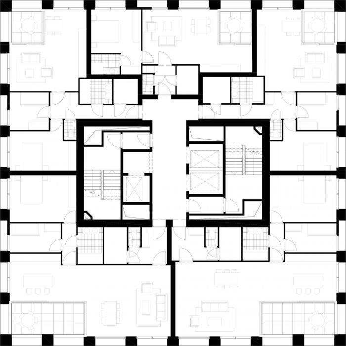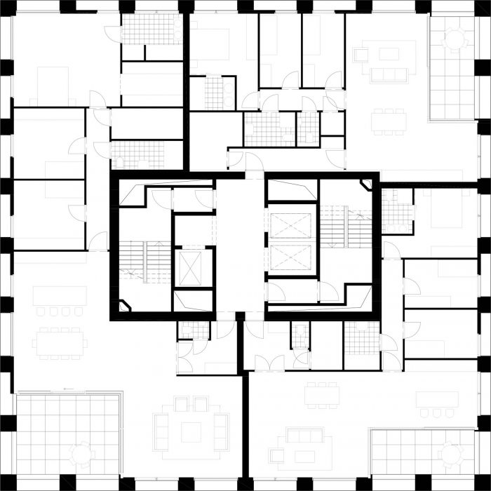 Despite this staggering of the columns in the façade, which greatly determines the view from the tower, the walls are load-bearing. Along with the core, they form the only load-bearing structures, so that the layout of each floor can be arranged in a flexible manner.