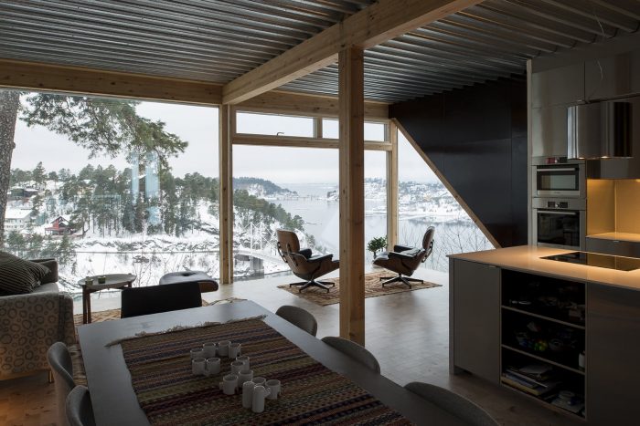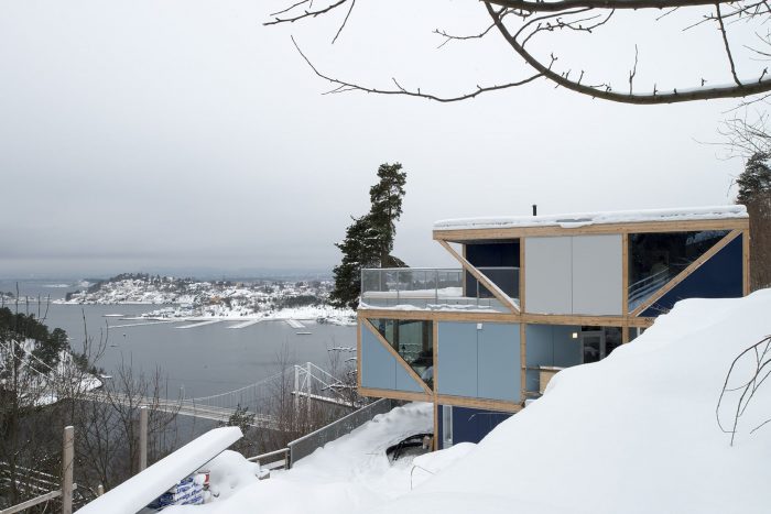 This is a house designed for two twins who want to live next to each other. The house is situated in a residential area of Oslo. The site was earlier a part of an old fruit garden located in a steep slope, with a spectacular view over the Oslo fjord.