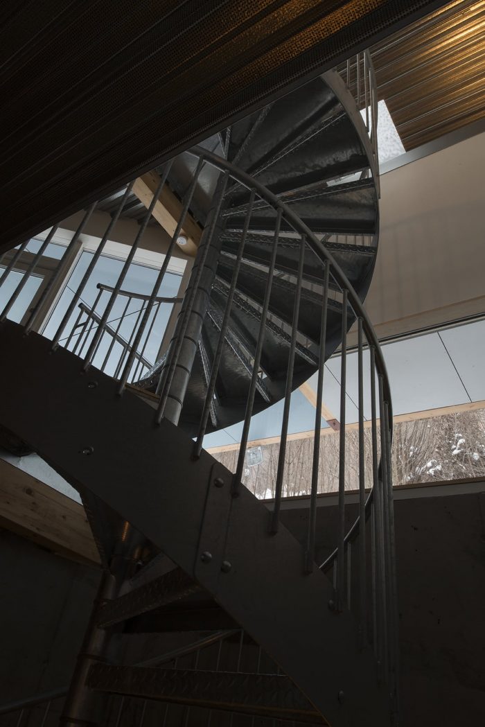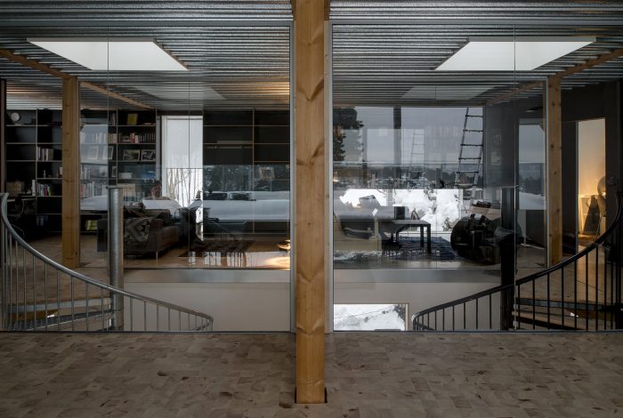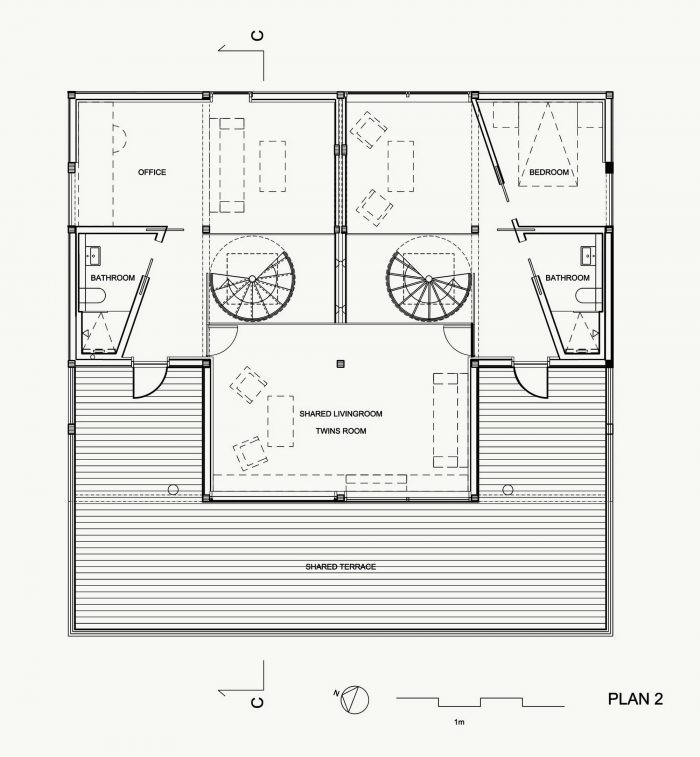 The building divides the site into two levels, with cantilevers framing the entrance in the back and sheltering a terrace in the front. The structure is a modular timber frame system that allows maximum flexibility concerning the twins' respective living situations over time. The timber frame is fixed onto a concrete slab foundation, and merges with decks of visible corrugated galvanized steel. The exposed and raw use of materials give the interiors an industrial look which responds to the modular system.
