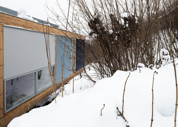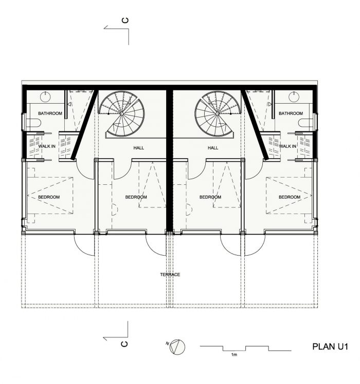The exterior cladding is a combination of high pressure laminated panels and large glass surfaces which are set into the exposed timber frame. The house is split vertically in two almost identical mirrored apartments. On the top floor a terrace can be accessed through a shared living room which connects the two apartments. Two skylights provide additional daylight through the stairwells to the lower floors and connect the four stories of the building. The programmatic usage of the house is very flexible, both vertically and horizontally.
