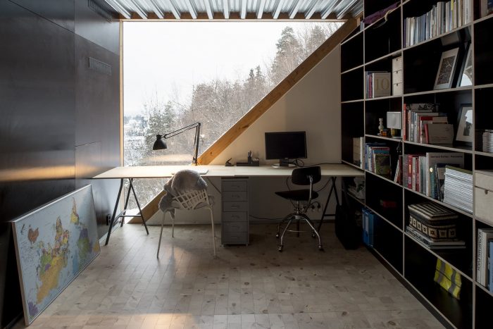 外部覆层是高压层压板和大玻璃表面的组合,被镶嵌在暴露的木质框架中。这座房子在垂直方向上被分割成两个几乎相同的镜像公寓。在顶层,可以通过连接两套公寓的共用客厅进入一个露台。两个天窗通过楼梯间向低层提供额外的日光,并连接建筑的四层。该房屋的程序性使用非常灵活,无论是纵向还是横向。