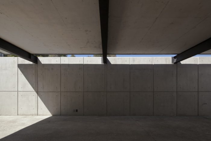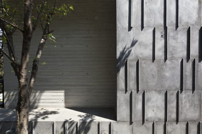 The materiality responds to the function of the spaces. The highest volumes containing the bedrooms reach the clarity of the sky. The social level, the one with access to the gardens is expressed with a heavier nature using black stone rhythmically divided by small ridges that provide a continuous play of light and shadow mimicking the volcanic local stone. This two make the volume look embedded into the soil. Finally, an in between concrete is used for all of the volumes that contain service spaces.