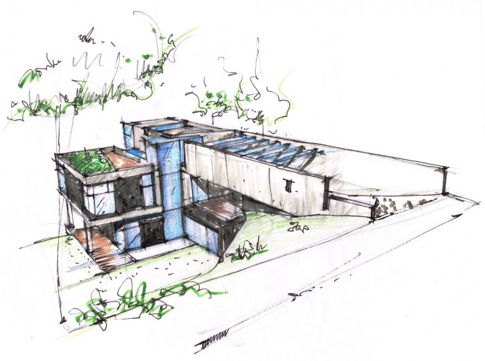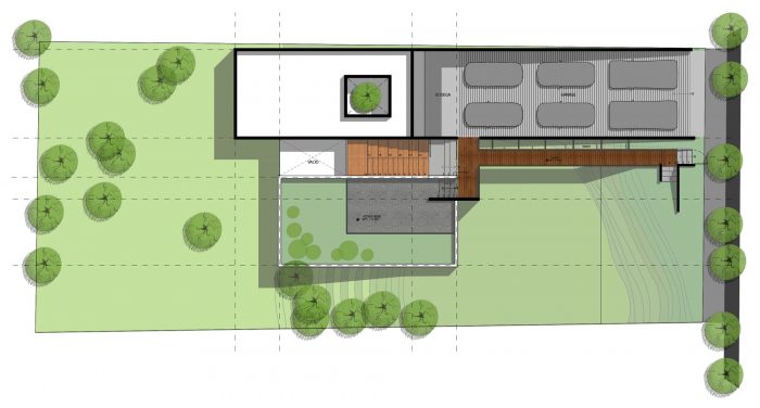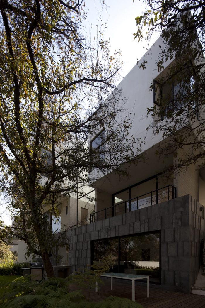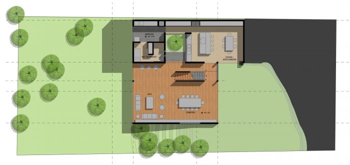 The parti questioned the typical sequence of a house, having its access in its roof to then descend into the private and social spaces of the house. A large number of trees served for tracing, framing the house and giving it more privacy.