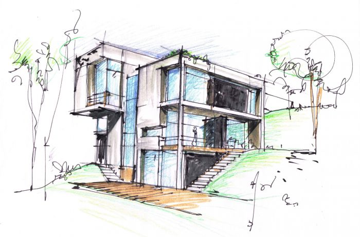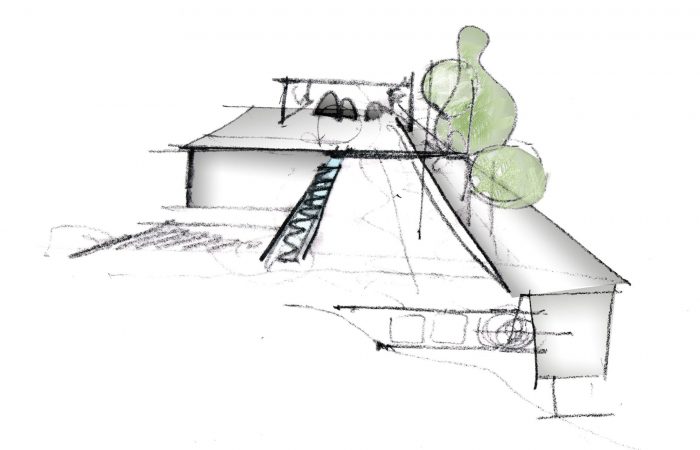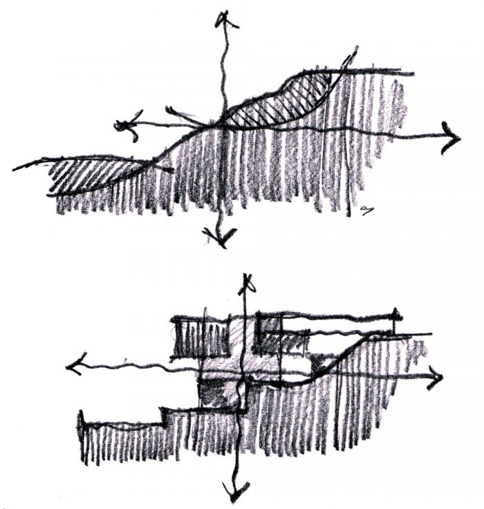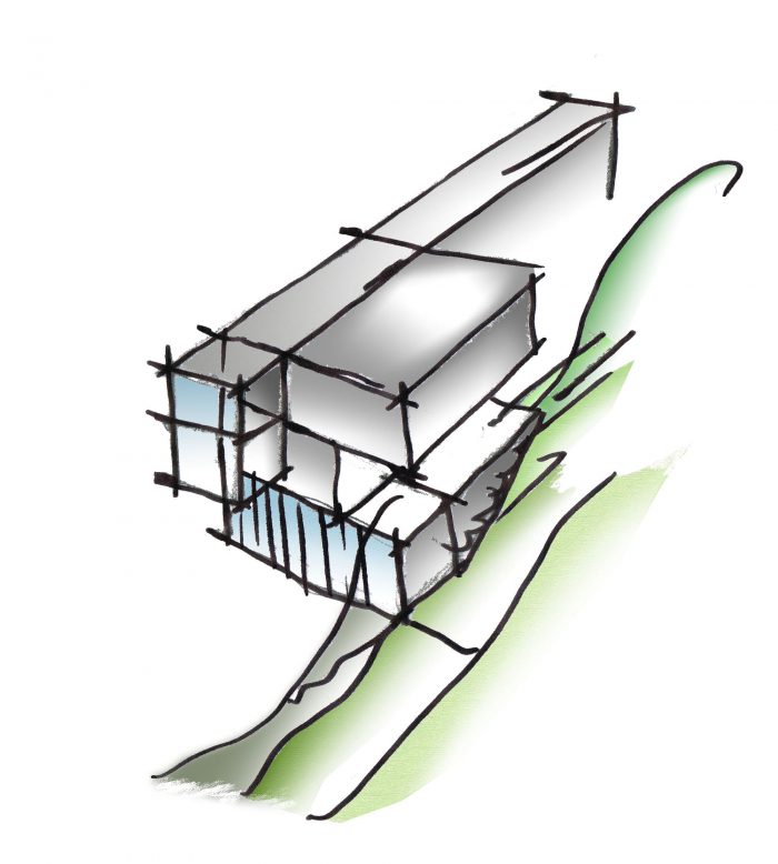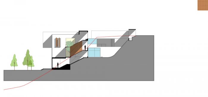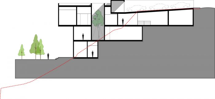 The exterior facade is sober and simple, hiding the house beyond and making evident the relationship between slope and horizon. After an entry portal, a bridge extends the transition from the street and becomes an observatory. By stepping away from the slope, the house reduces its footing and frees up the most of green surface.