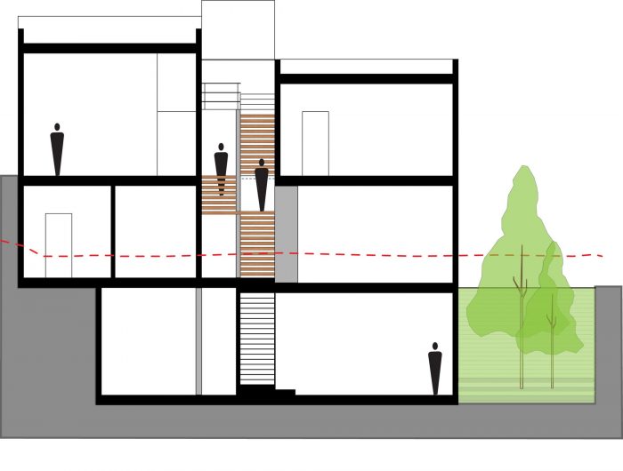 这座建筑对房屋的典型顺序提出了质疑,它的入口在屋顶,然后下降到房屋的私人和社会空间。大量的树木起到了追踪的作用,为房子提供了框架,并给它更多的隐私。