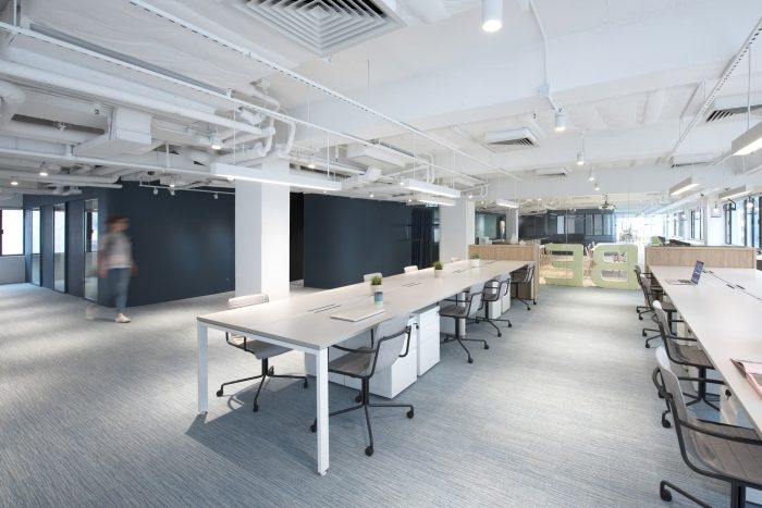 Referencing the local urban life, the reception introduces vibrantly coloured tiled walls and floors, contrasted with handcrafted neon signage, while a padded felt wrapped reception desk is reminiscent of luxurious car seating. An intricate wall art by local artist Bao Ho envisions a floating city vessel, packed with Hong Kong landmarks, futuristic transports and lucky Feng Shui symbols for the company. Staff is in turn encouraged to express themselves creatively through writable walls and columns.