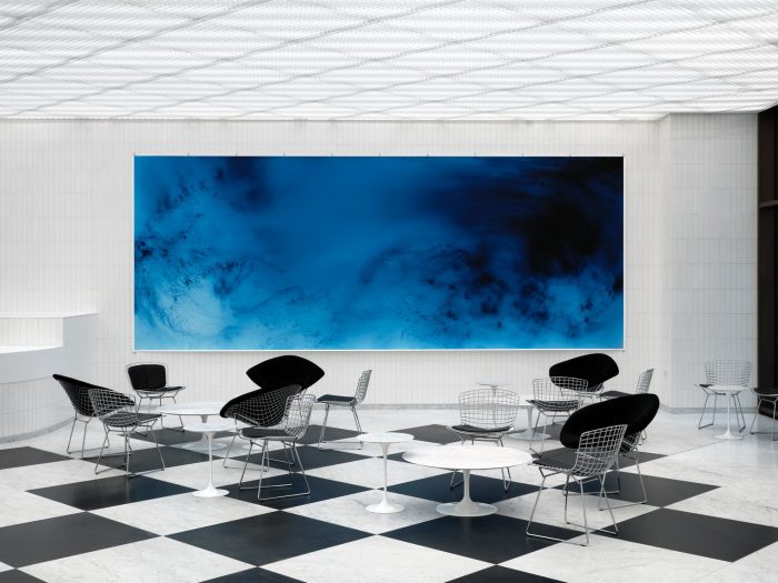 A Generous Sequence of Spaces. The lobby’s entry features large windows clad in bronzed metal which blend in with existing retail facades on Oxford Street. Revolving doors in chromed stainless- steel establish a relationship with the mirrored columns inside. Installed on the right wall of the lobby, an artwork by Wolfgang Tillmans corresponds to the exterior and interior alike.