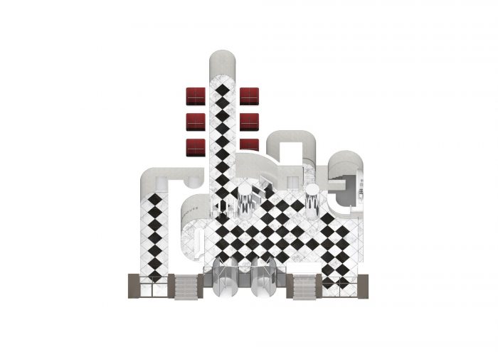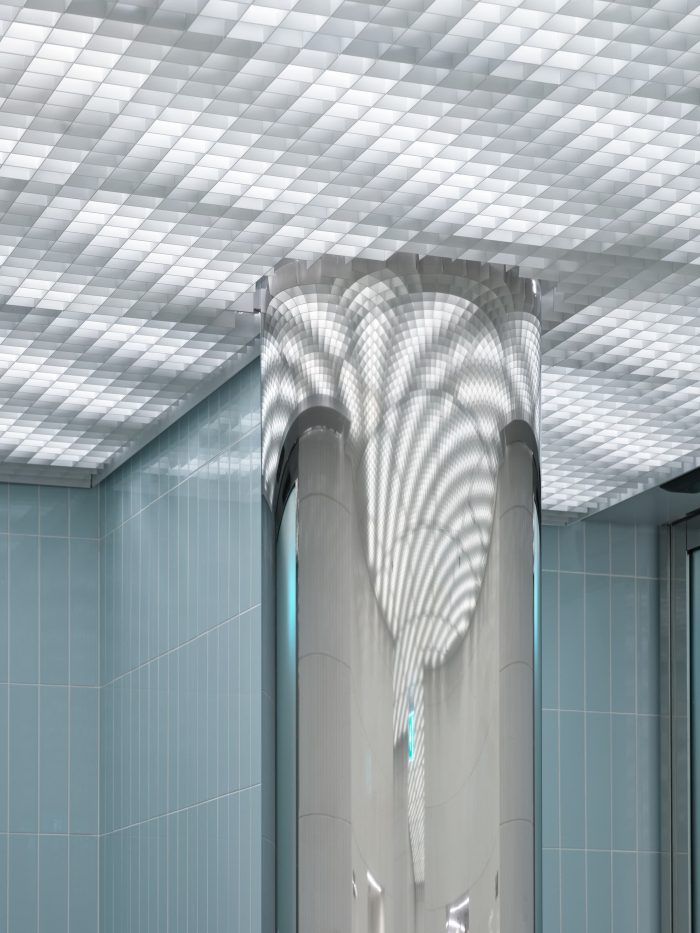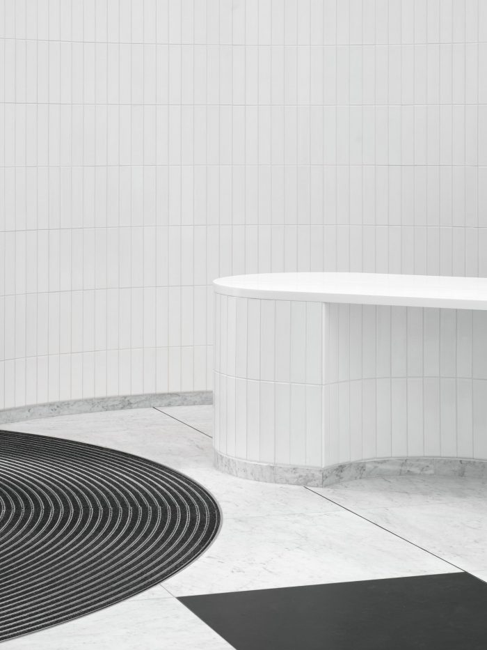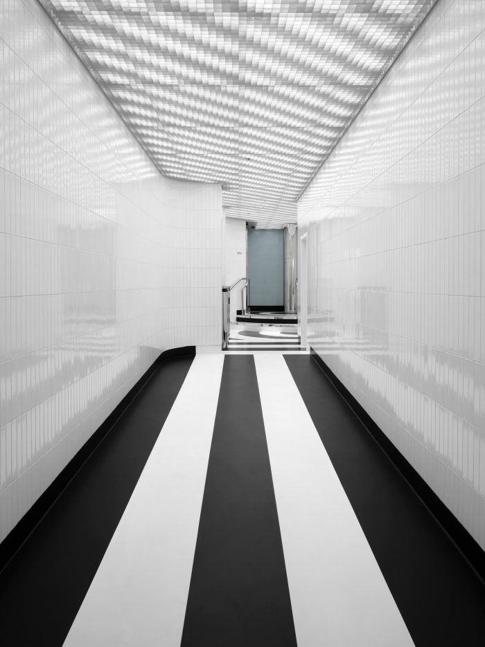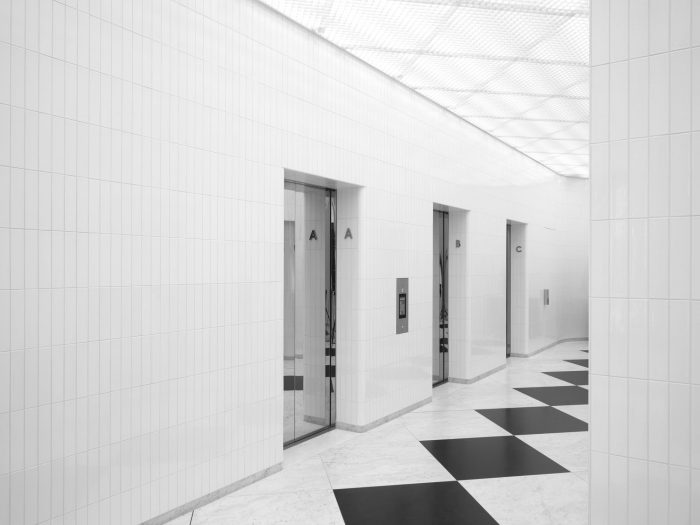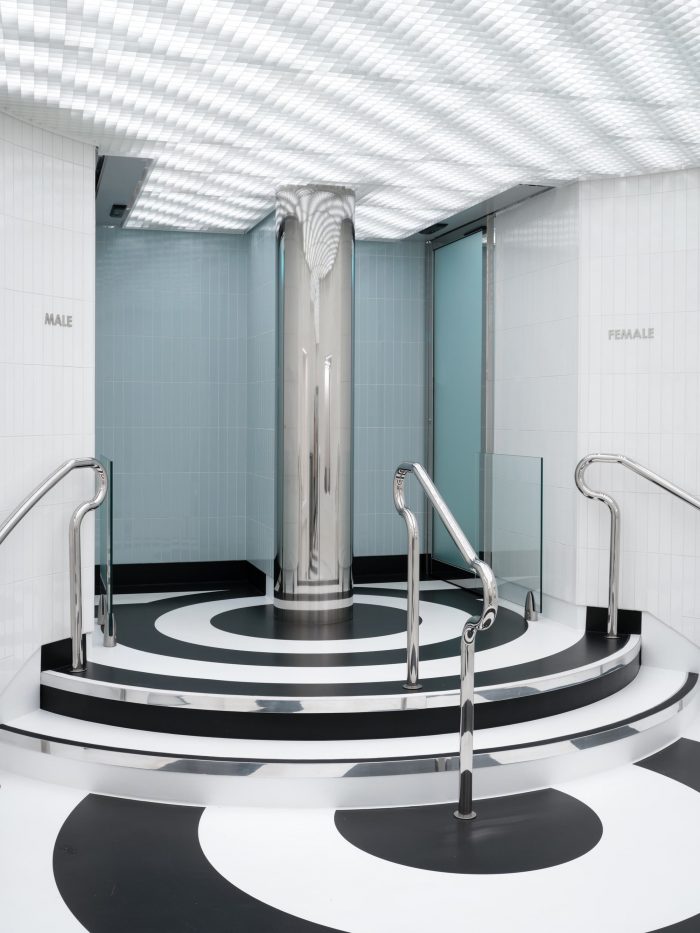 The space of arrival consists of a front desk and ancillary space for meetings and exchange, with an adjacent coffee point. The lobby walls formally reference the Baroque curves of the UK House facade, and its “apse”-like endings prevent abrupt confrontations. Polished chrome elements, such as circular columns or elevator doors, continue throughout. In an apparent historical reference, a combination of white and black stone forms checkered marble flooring. The suspended metal grill ceiling includes linear light that follows the area’s primary spatial directives. Bespoke ceramic tiles cover the walls, richly textured, but subtle and neutral in color, devising a robust backdrop to the dramatic forms of the new lobby.