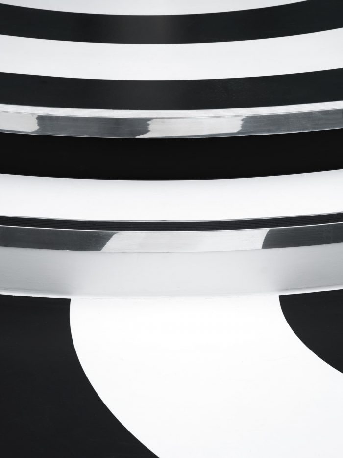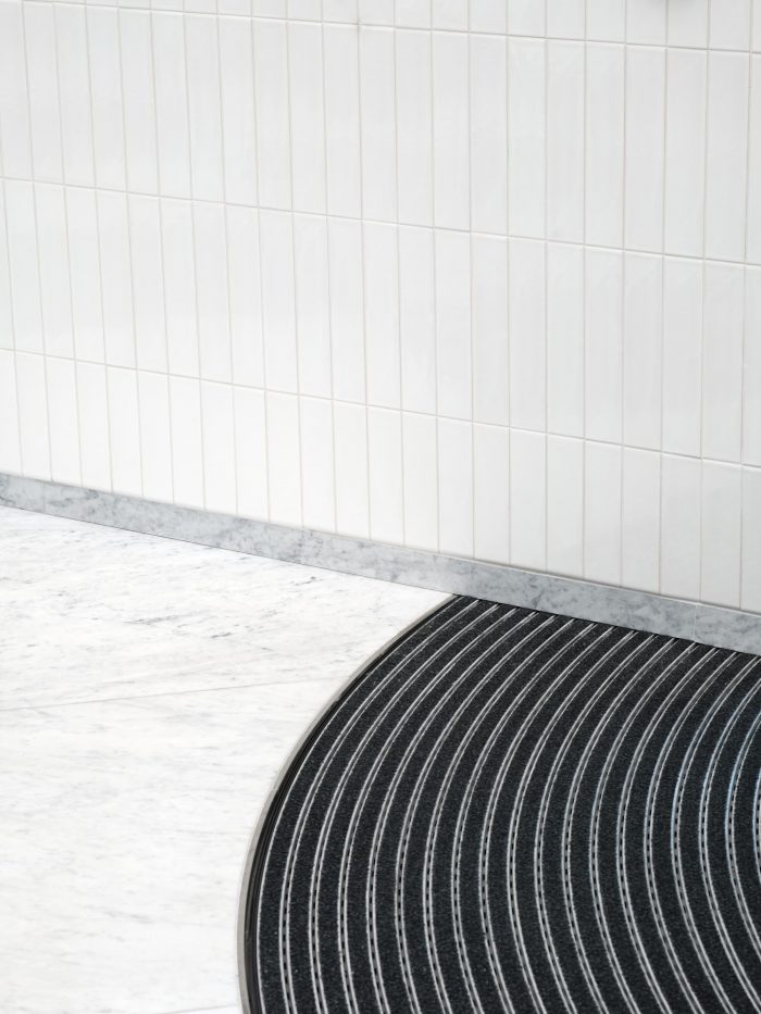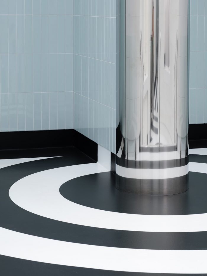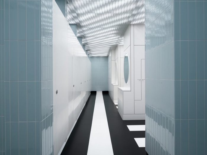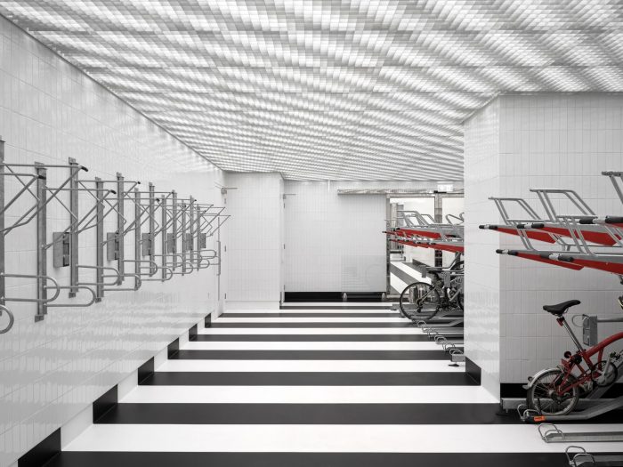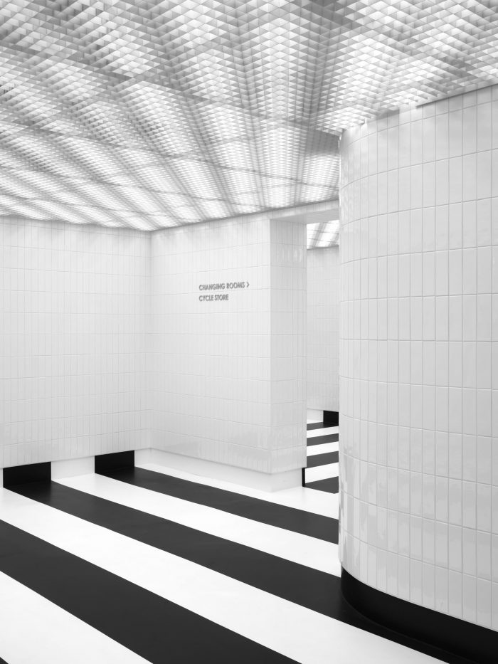Connected via new staircases and elevators, the unique blend of hyper-modern and historical elements continues below ground. Epoxy floors with a black and white pattern demark the cycle route and lead to the bike store. A changing lobby, the central space for tenants arriving on two wheels, is defined with circular accents. Adjacent facilities with showers and lockers provide functional, yet luxurious facilities.