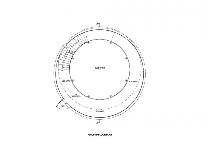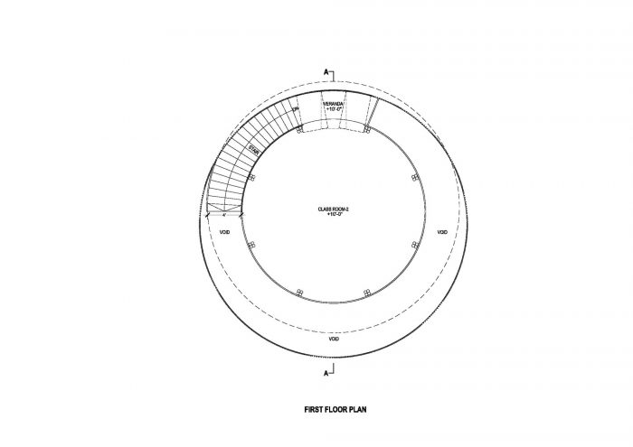 Because of the scarcity of free spaces available within the high density camp areas, the footprint of the structure had to be kept to a minimum. But it opens up inside by way of separation of the inner structure and the ‘skin’ of the outer peripheral screen. The latter serves as a filter against external noise, rain and solar heat gain. This breathing screen lets in filtered light and helps to keep a naturally comfortable environment indoors while offering a veritable connection to the outside. The articulation of the two classrooms connected by a curving stair helps to provide exciting playful spaces for small children. The day-school can function fully without power, helped by the light pouring into the threshold space open to the sky.